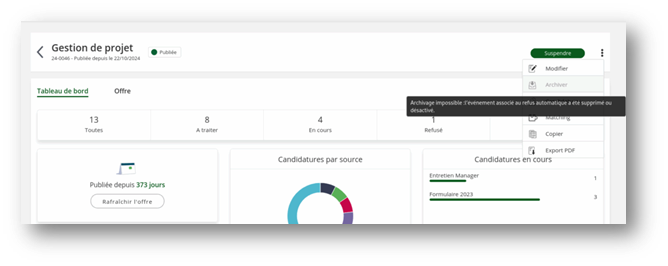 - Vous gagnez du temps en évitant de réaliser une action en masse de refus sur toutes les candidatures rattachées à l’offre que vous souhaitez archiver.