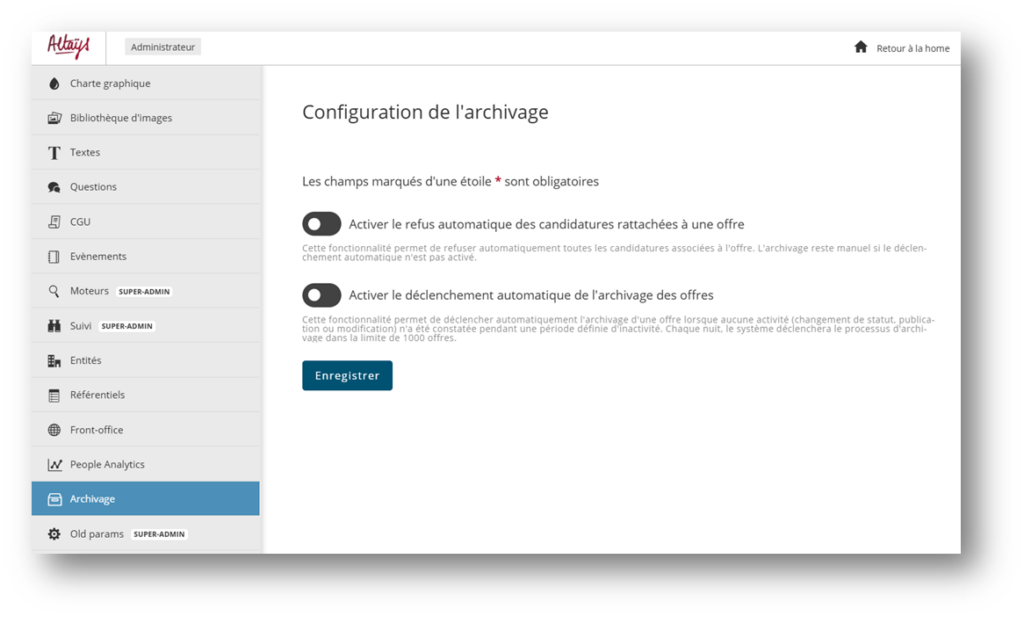 - Renseigner le nombre de jour avant archivage automatique. A noter, si 90 jours sont configurés alors toutes les offres qui datent de plus de 3 mois n’ayant reçu aucune modification, changement de statut (ex : suspendu…) seront automatiquement archivés.
