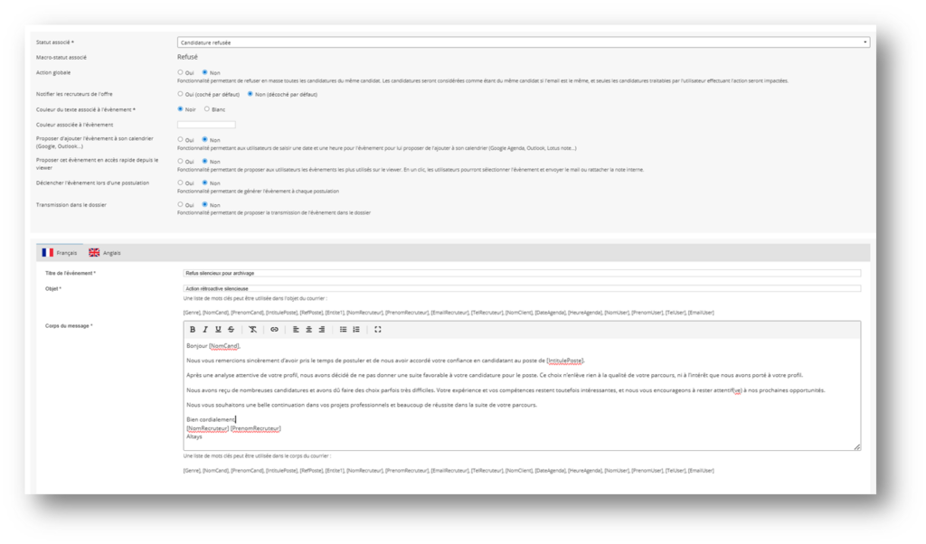Vous souhaitez configurer l’archivage automatique, toutefois vous préférez ne pas envoyer de communication aux candidats, il vous suffit :