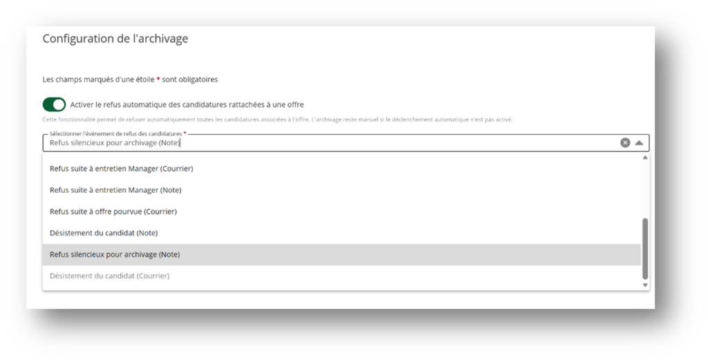 Pour configurer l’archivage automatique avec un refus communiqué à vos candidatures oubliées, il vous suffit de :