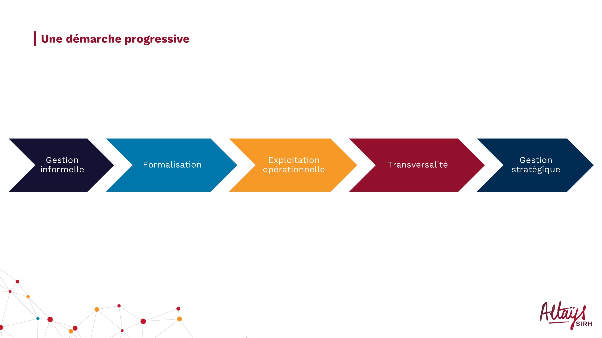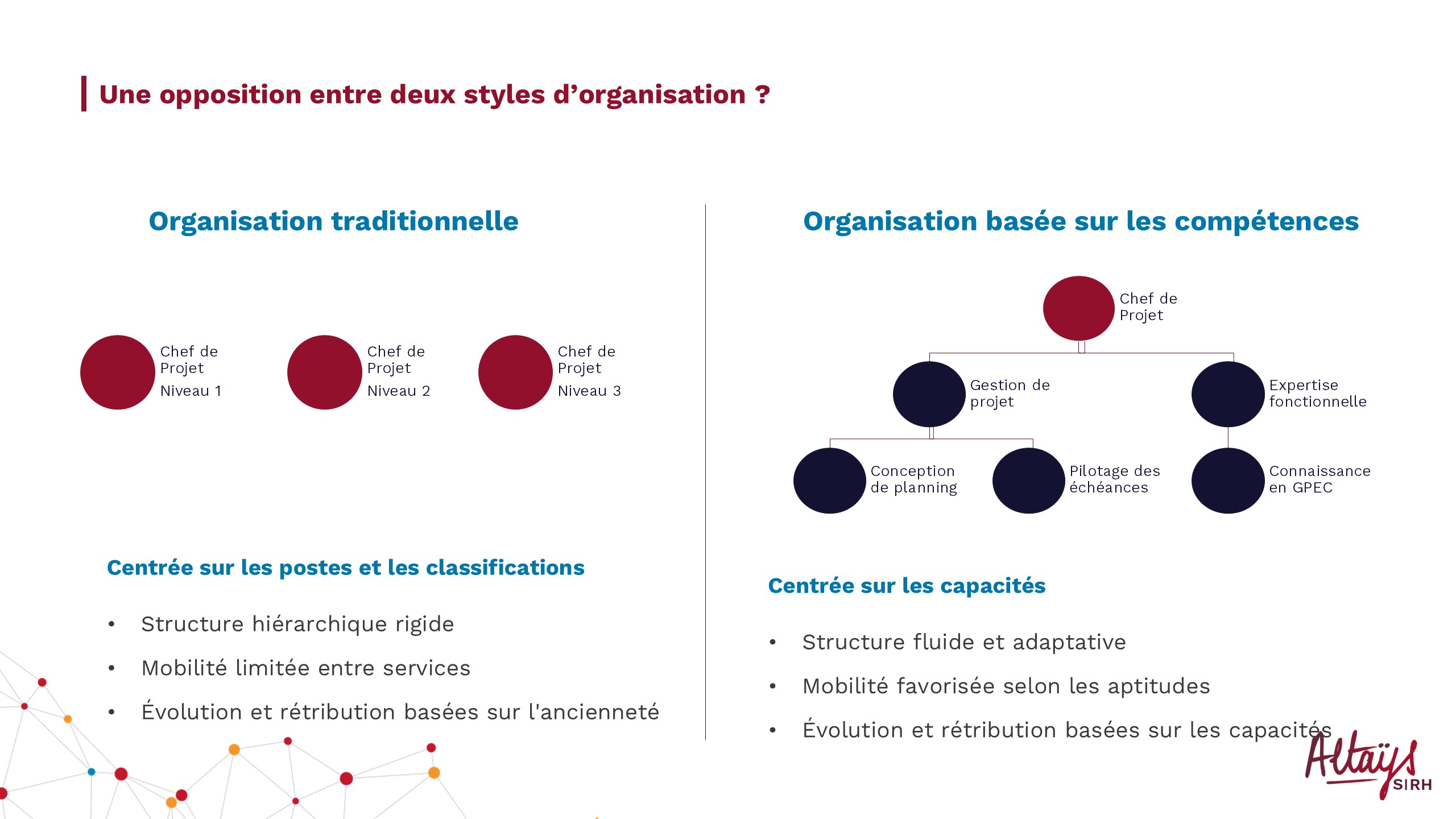 Dans cette seconde organisation, on va favoriser la transversalité, la capacité à faire céder des barrières en terme d’évolution, de mobilité dans l’entreprise et donc la capacité à transformer l’entreprise. Cependant chez Altays on pense que la vérité n’est pas forcément derrière cette caricature de deux organisations totalement opposées, que cette orientation SBO est plutôt une démarche progressive jalonnée par différents stades de pilotage par les compétences et nous pensons que toutes les entreprises font plus ou moins du pilotage par les compétences car cela commence par une gestion informelle.