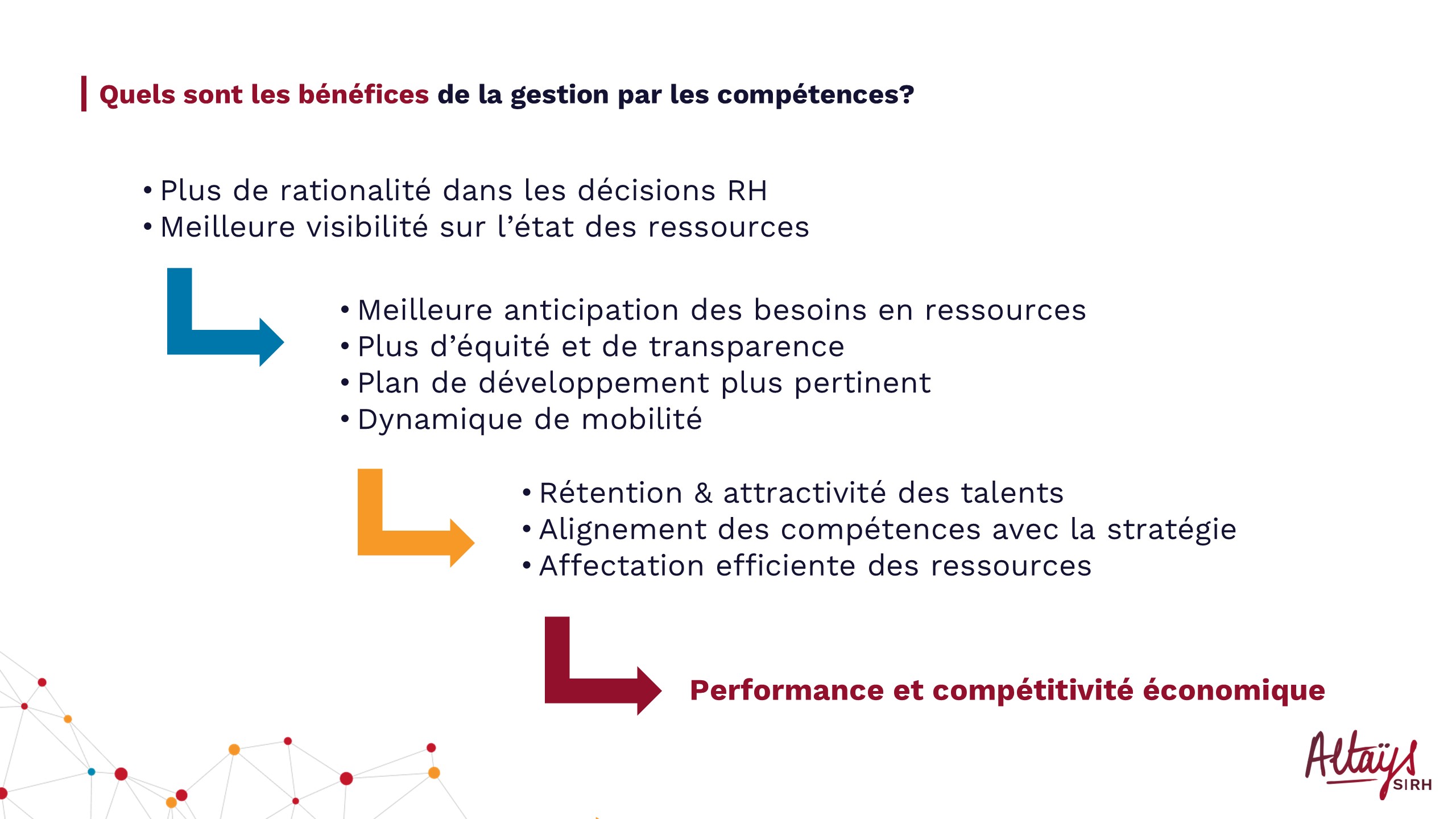 Le premier je l’ai cité c’est plus de rationalité dans les décisions RH et puis une meilleure visibilité sur l’état des ressources. Je reviens sur la rationalité et je rebondis sur un sujet qui est dans l’actualité actuellement « la directive sur la transparence des salaires ». Je pense qu’il y a un enjeu derrière cette future modification de la loi d’être responsable de l’objectivation de la valeur du travail. Le législateur ne va pas définir à la place des gestionnaires RH quelle est la valeur du travail entre deux postes, comment les comparer mais il va falloir plutôt mettre en place des dispositifs pour la justifier a posteriori. Le pilotage par les compétences fera partie des outils qui permettront d’expliquer la valeur travail et de justifier les décisions. Donc il y a un bénéfice de plus à attendre, c’est la conformité juridique. La mise en place agira par vagues : une fois que vous avez les piliers c’est-à-dire la meilleure visibilité, la meilleure rationalité vous pouvez espérer avoir une meilleure anticipation des besoins en ressources ainsi que plus d’équité et de transparence, des plans de développement plus pertinents, plus précis et une vraie dynamique de mobilité. En cascade tout ça va aider à avoir une meilleure rétention et attractivité des talents. Les compétences seront alignées avec la stratégie avec une affectation efficiente des ressources et tout cet ensemble doit nous conduire à une meilleure performance et à une meilleure compétitivité économique. A contrario si on ne le fait pas il y a quand même un risque de se retrouver avec une obsolescence en terme de compétences et aussi des problèmes.