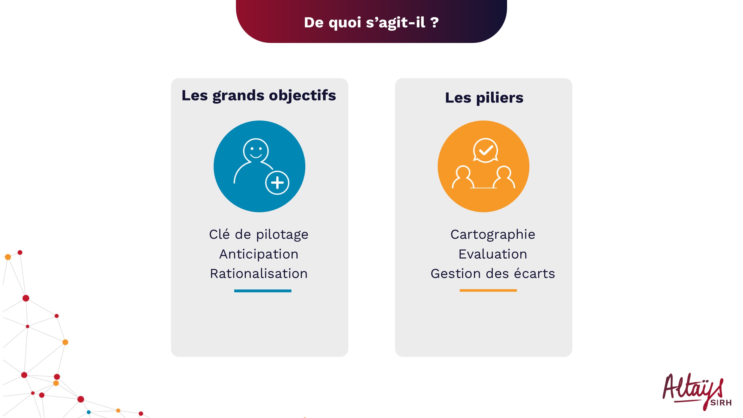 C’est un sigle anglosaxon – ce qui fait tout de suite très sophistiqué – mais je vais vous donner notre vision et nous allons essayer de décrire le concept en termes simples, sous la forme tout d’abord de grands objectifs car pour nous c’est avant tout une clé de pilotage de l’organisation en tout cas a minima des ressources humaines de l’organisation. Elle peut s’ajouter à d’autre clés de pilotage mais pour nous elle doit permettre l’anticipation et surtout la rationalisation de tous les choix qui peuvent être faits dans l’entreprise. Et ensuite, elle se définit en termes de piliers par des choses assez simples que vous devez connaître : la cartographie des besoins en termes de compétences pour l’entreprise et puis la capacité à pouvoir évaluer et évidemment pouvoir déterminer des écarts entre les besoins et les ressources en compétences dont vous disposez et le troisième pilier le plus intéressant sera la gestion des écarts, les actions qu’on va mettre en place pour résorber les écarts constatés.