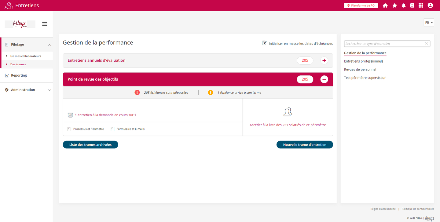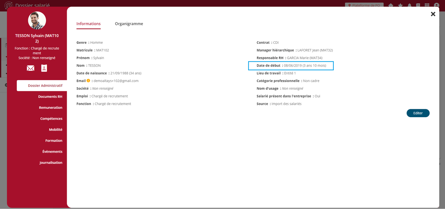 Lors de la création d’un nouveau dossier cette date est désormais générée à partir de la “Date d’entrée dans la société” renseignée dans la fiche individuelle du collaborateur. La première date d'échéance correspond donc à la date de début additionnée du nombre de mois défini dans la fréquence du type d’entretien.