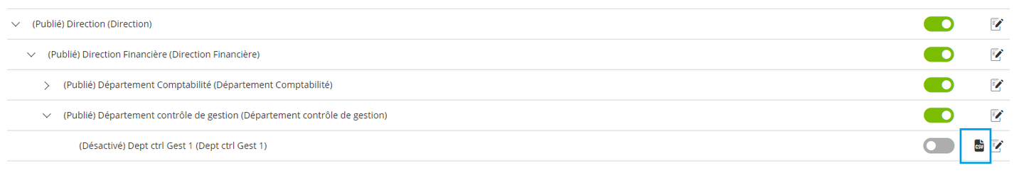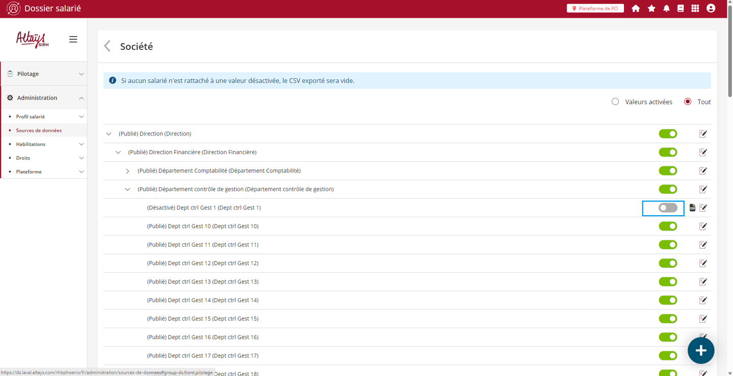 En complément, pour aider l’administrateur à retrouver les collaborateurs associés à des valeurs inactives, une nouvelle option est ajoutée au niveau des écrans de gestion des sources de données pour lui permettre d’extraire les collaborateurs associés à une telle valeur (la valeur n'étant plus disponible dans les filtres de recherche des autres pages). La fonctionnalité permet de télécharger la liste des collaborateurs sous un format CSV correspondant au modèle d’import des salariés, facilitant la correction de l’affectation des collaborateurs.