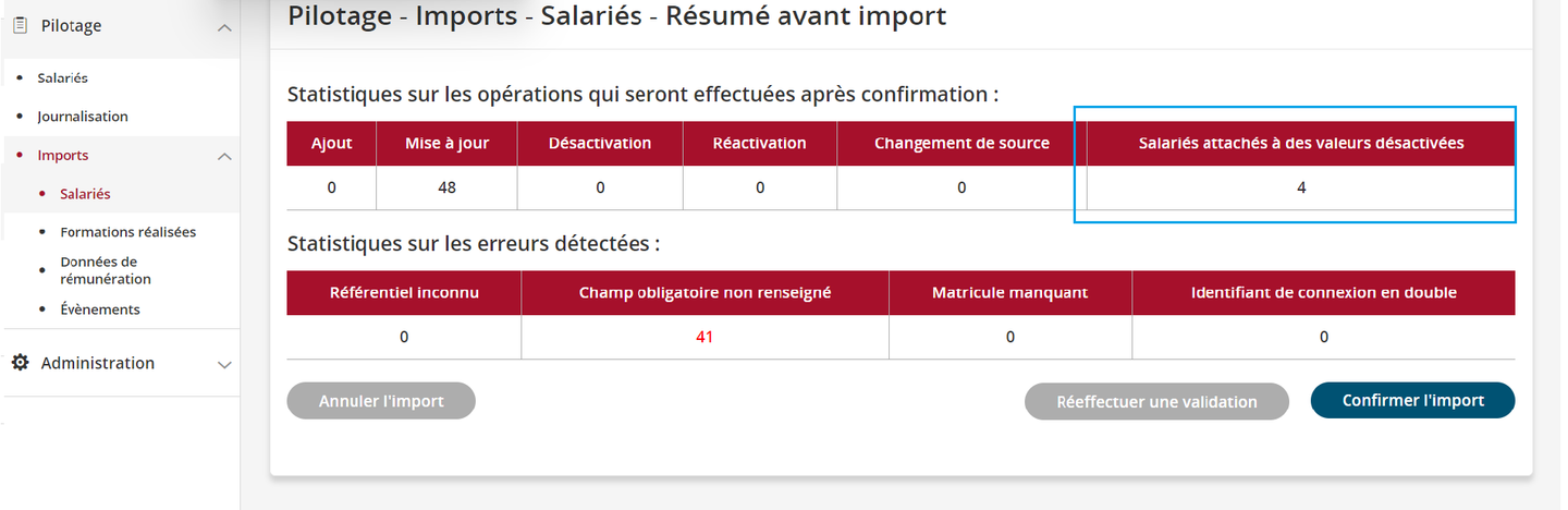 Aucun contrôle n’est effectué concernant l’affectation de dossiers à des valeurs inactives lors des imports manuels ou automatiques. Toutefois, un nouvel indicateur est ajouté dans le récapitulatif d’import pour indiquer le nombre de collaborateurs importés sur des valeurs inactives.