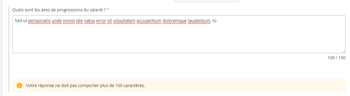 Un compteur de nombre de caractères est ajouté aux composants du formulaire de type “Paragraphe de saisie” lorsque ces derniers sont paramétrés avec un nombre limite de caractères. Aussi lorsque le nombre maxmum est atteint, les caractères suivants ne sont pas pris en compte et un message d’alerte est affiché sous le champ.