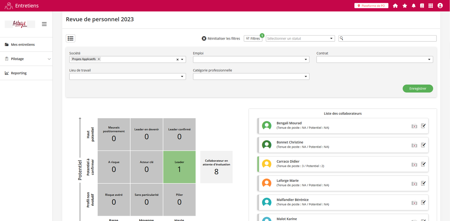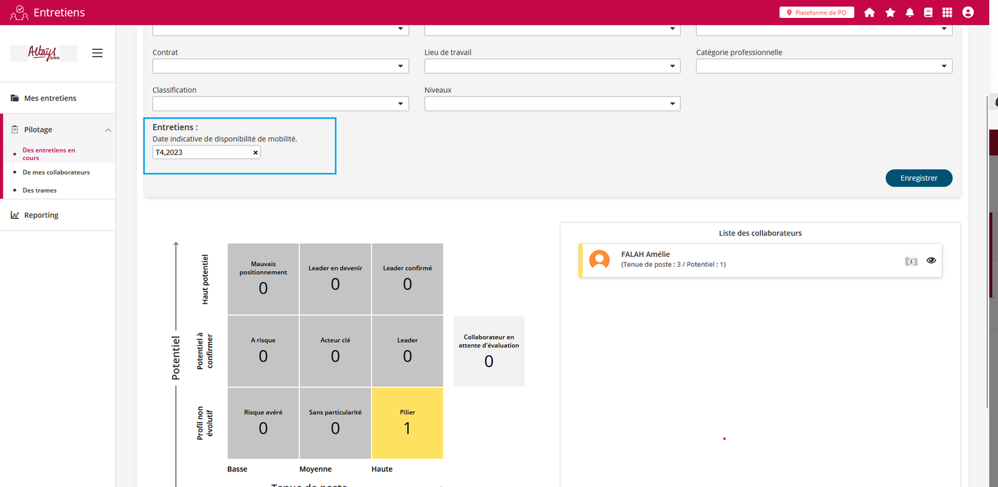 Un nouveau filtre est ajouté à la matrice Ninebox utilisée lors des revues de personnel. A la différence des autres filtres, il ne se base pas sur les données du dossier collaborateur mais sur la situation de mobilité du collaborateur. Le filtre “ Date indicative de disponibilité” permet de rechercher les collaborateurs en fonction de l'échéance de leur projet professionnel et ainsi de réaliser la revue en tenant compte de cette information pour gérer les priorités.