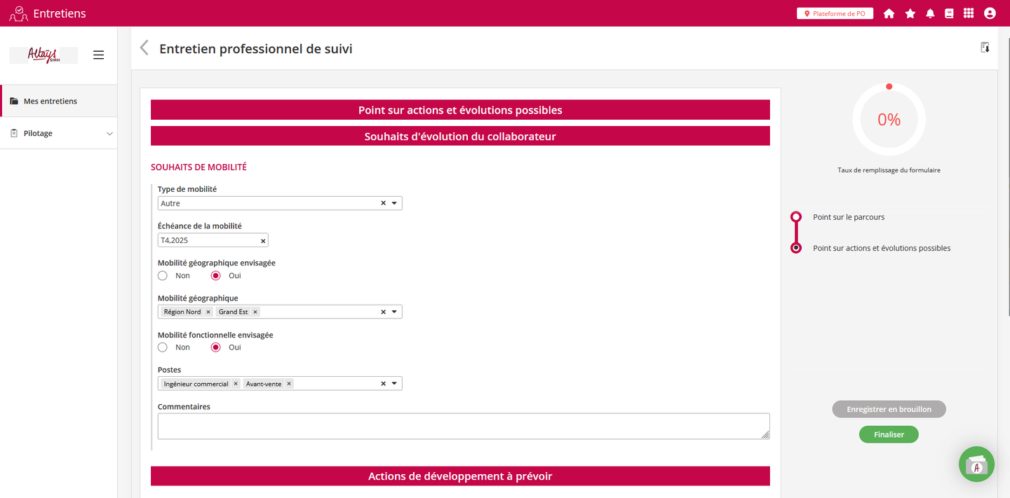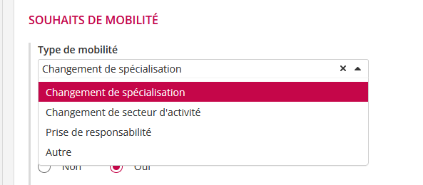 La gestion des souhaits de mobilité se dynamise à travers un nouveau composant du formulaire d’entretien permettant de faire circuler l’information entre les entretiens et le dossier salarié. Il peut être ajouté dans les formulaires d’entretien pour identifier avec le collaborateurs ses aspirations diverses et plus particulièrement s’il souhaite changer de zone géographique ou de métier.