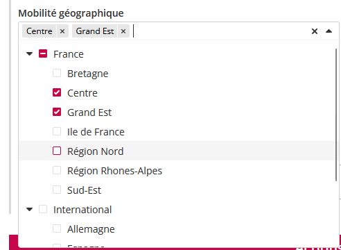 Il peut sélectionner les zones géographiques cibles. Ces zones sont issues du référentiel “Mobilité géographique” administré depuis le module Dossier salarié.