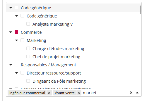Une évolution ergonomique a été réalisée dans les modules Dossiers Salariés et Entretiens au sujet de l’affichage des listes de valeurs. L’objectif de cette évolution est d’offrir une meilleure expérience aux utilisateurs lors de l’utilisation de listes présentant un grand nombre de données ou une hiérarchisation des valeurs sur plusieurs niveaux (arborescence). Ce nouveau format est principalement disponible dans les moteurs de recherche (ex : recherche de collaborateurs dans une campagne) et se caractérise par: