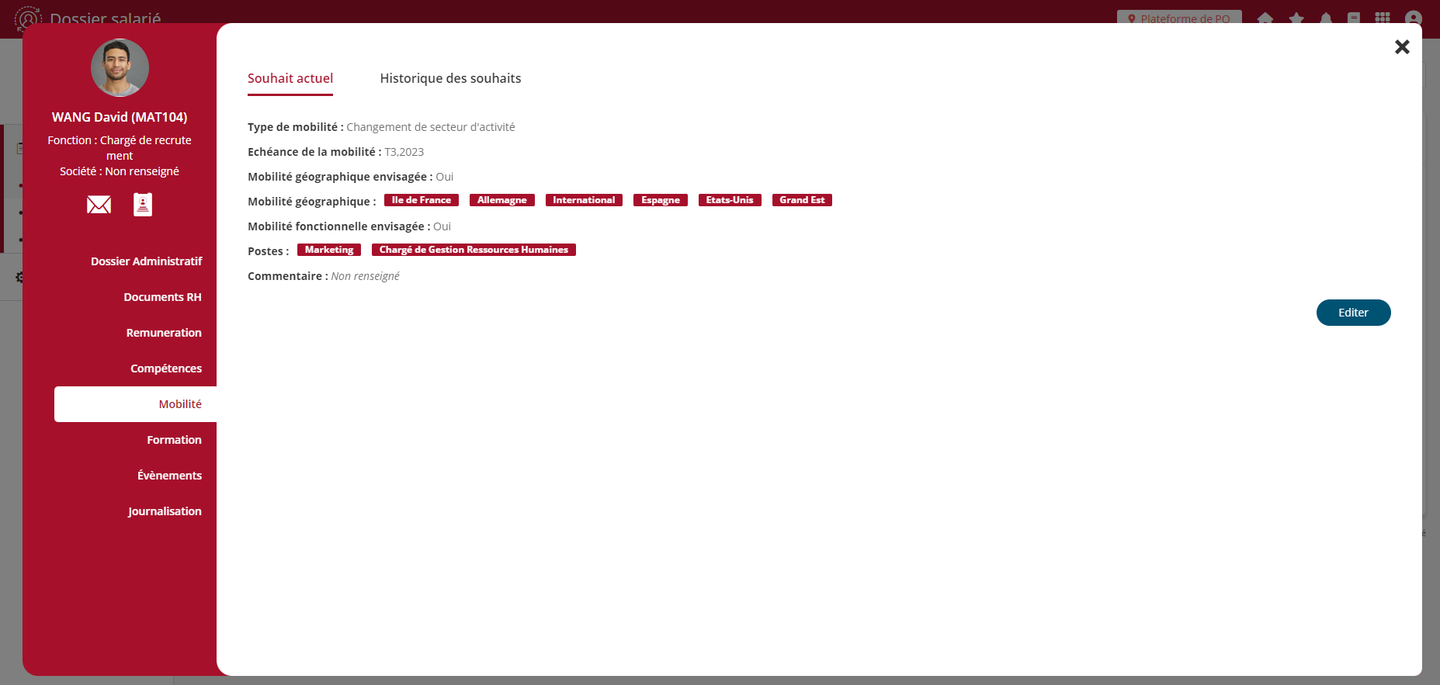Les souhaits peuvent également être édités depuis la fiche du salarié par les profils bénéficiant d’un droit de modification sur les informations des salariés.