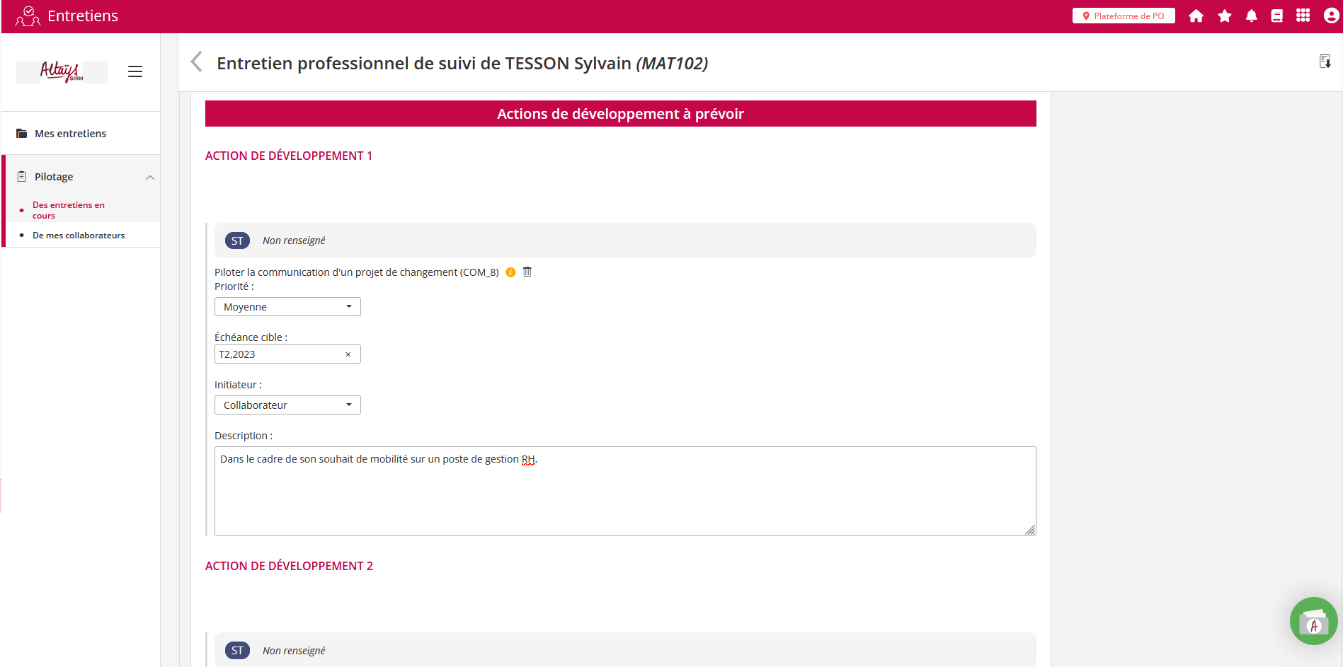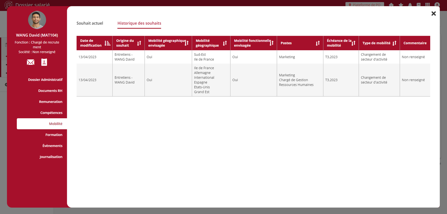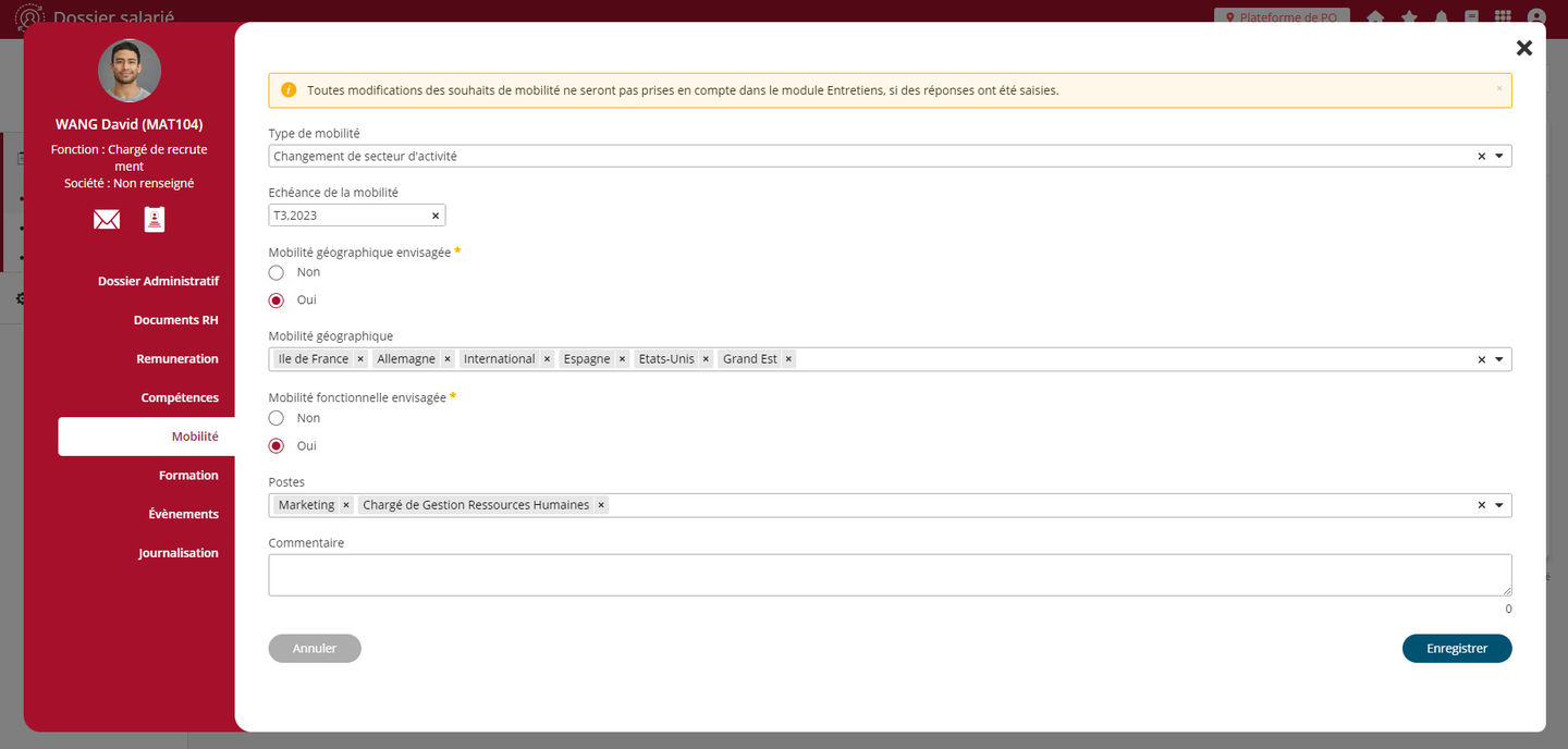 Une des principales nouveautés de cette évolution réside dans la possibilité de centraliser les projets d'évolution émis dans les entretiens au niveau de la rubrique “Mobilité” de la fiche individuelle du salarié. Ainsi les souhaits émis dans un entretien, dont la phase responsable est complétée, sont transférés dans le dossier du salarié.