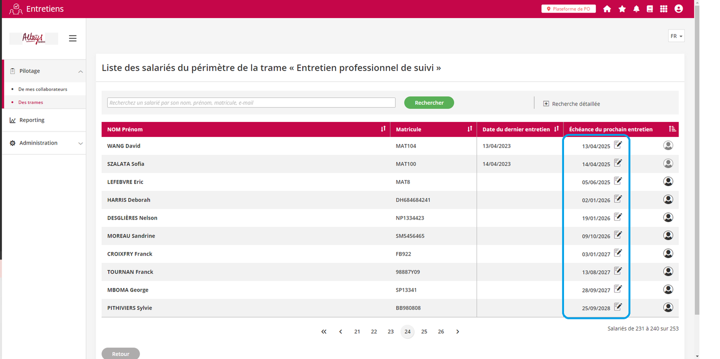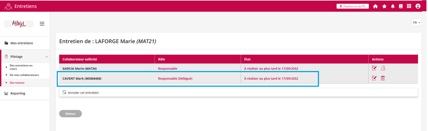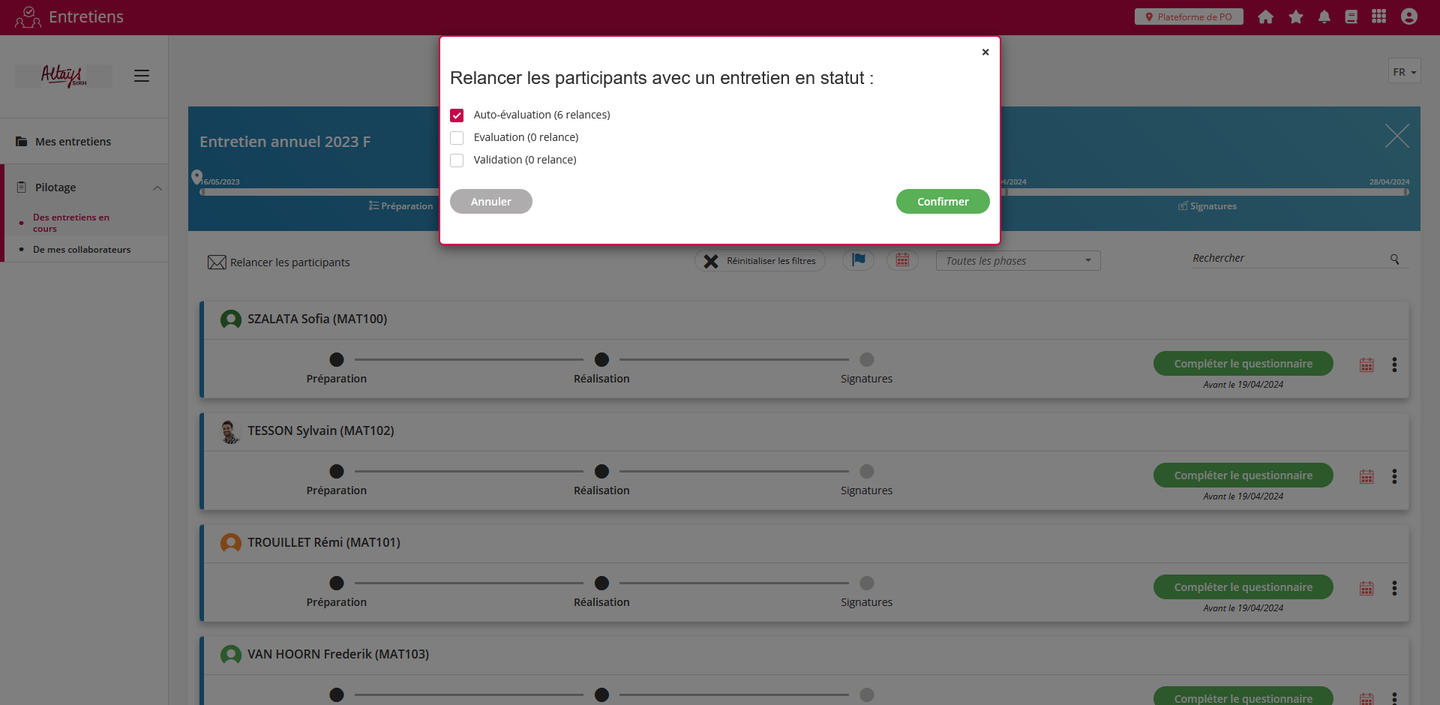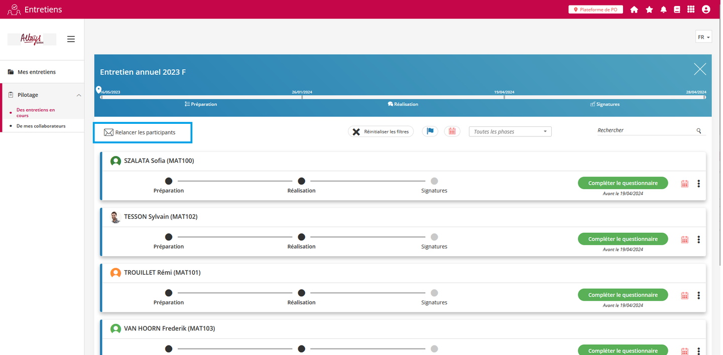 La fonctionnalité de relance a été étendue aux profils “Responsable”. Ces profils disposent à présent du bouton de relance dans l’interface de suivi des entretiens à faire.