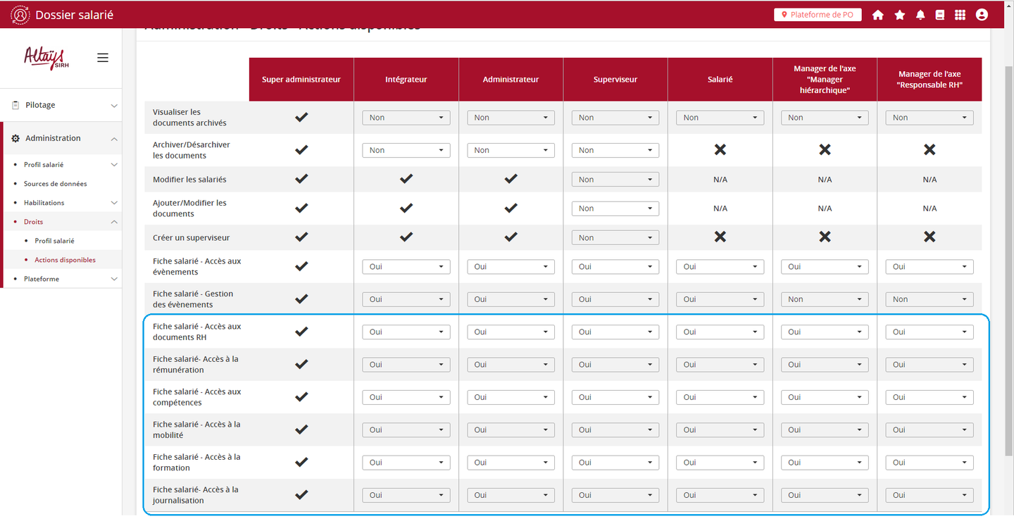 La console de paramétrage des actions disponibles évolue pour intégrer la possibilité d’activer ou non par profil les rubriques de la fiche salarié. Ces nouvelles fonctionnalité offrent plus de granularité dans la gestion des accès.
