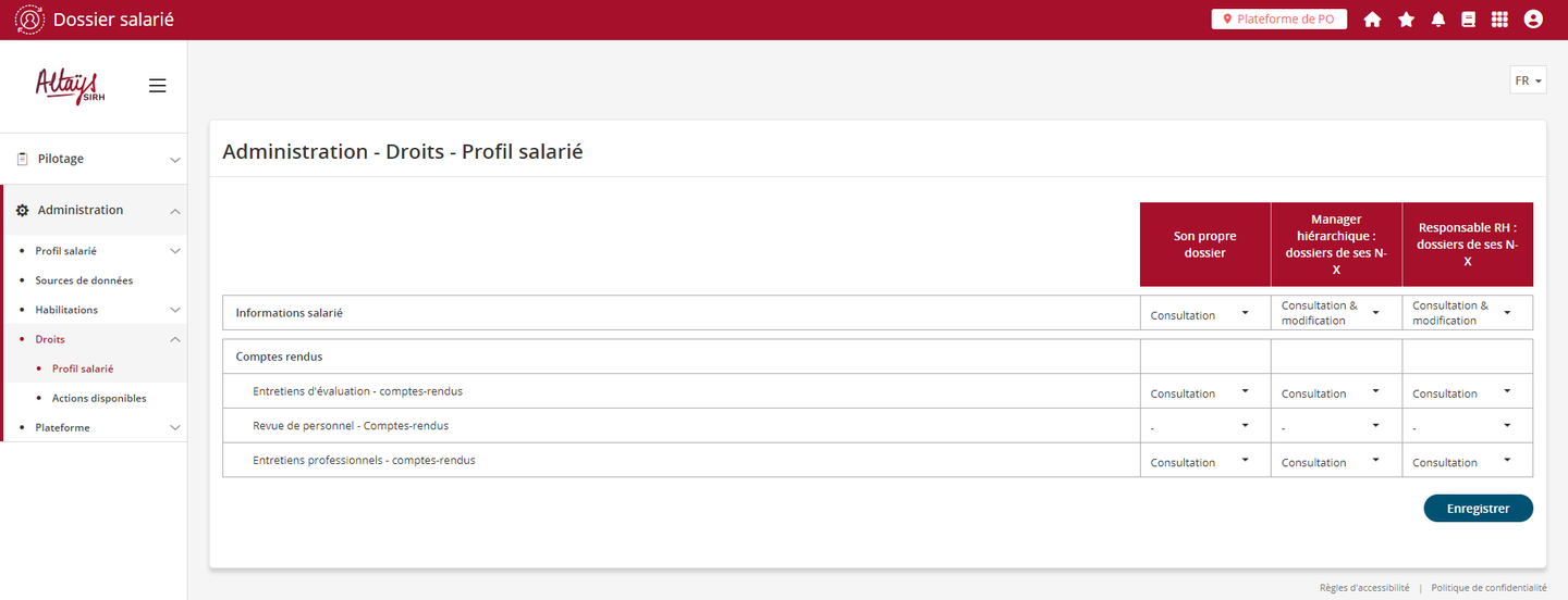 Ces configurations, pour les profils Salarié et Responsable, restent toutefois subordonnées aux paramétrages de la page “Profil salarié” et plus particulièrement de la ligne “information salarié” qui déterminent si ces acteurs ont accès ou non à la fiche individuelle de manière générale. Ce paramétrage permet également de déterminer si l’accès aux rubriques de la fiche est en consultation uniquement ou en modification.