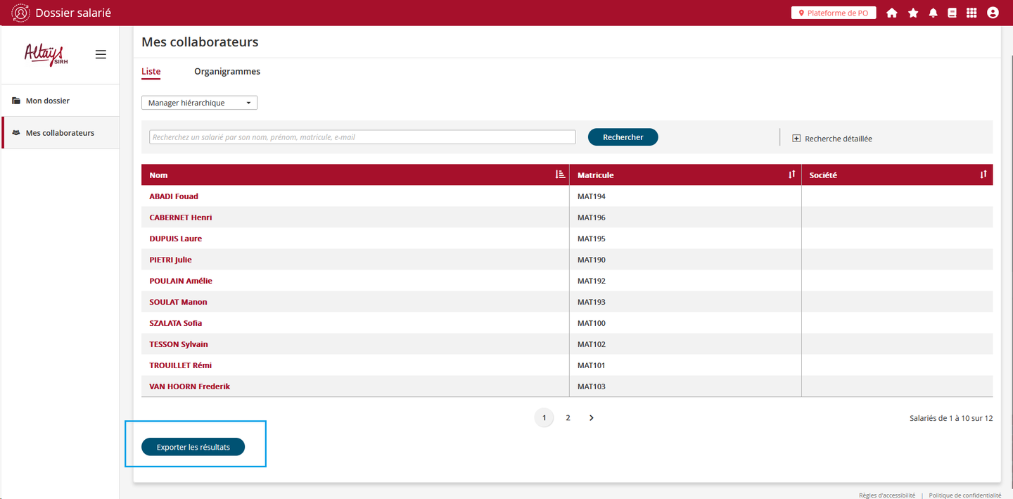 Le bouton d’export des collaborateurs, déjà disponible pour les rôles administrateur et superviseur, est désormais proposé aux profils de type “responsable”.