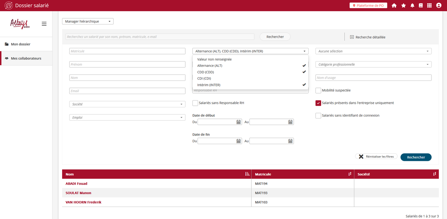 Ainsi un collaborateur, après désactivation n’est plus visible dans cette vue.