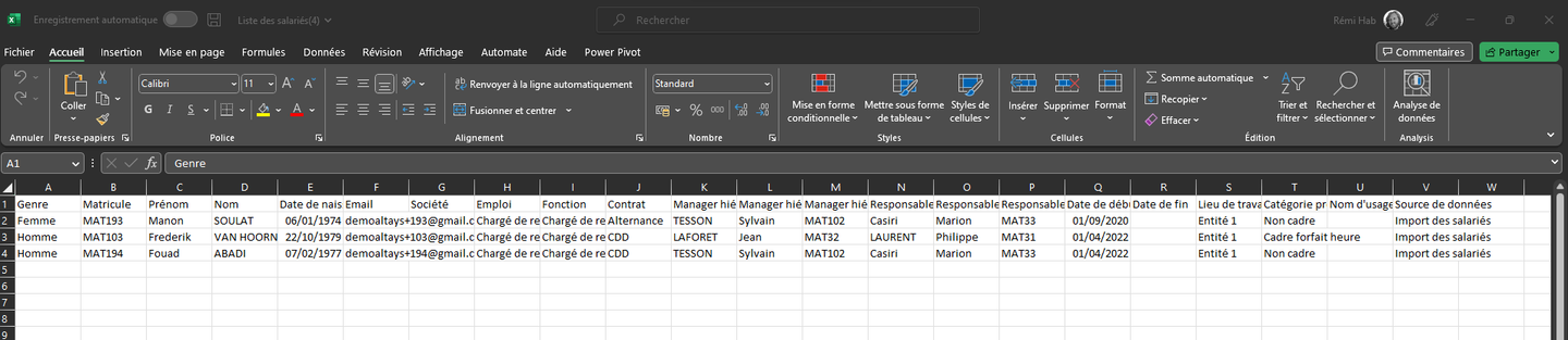 Il permet d’exporter la liste des collaborateurs et leurs données administratives sous Excel en tenant compte des filtres de recherche sélectionnés.
