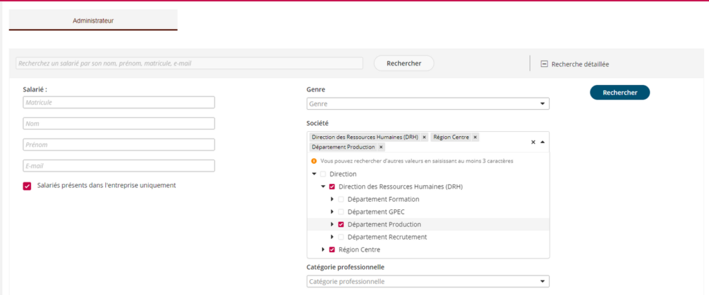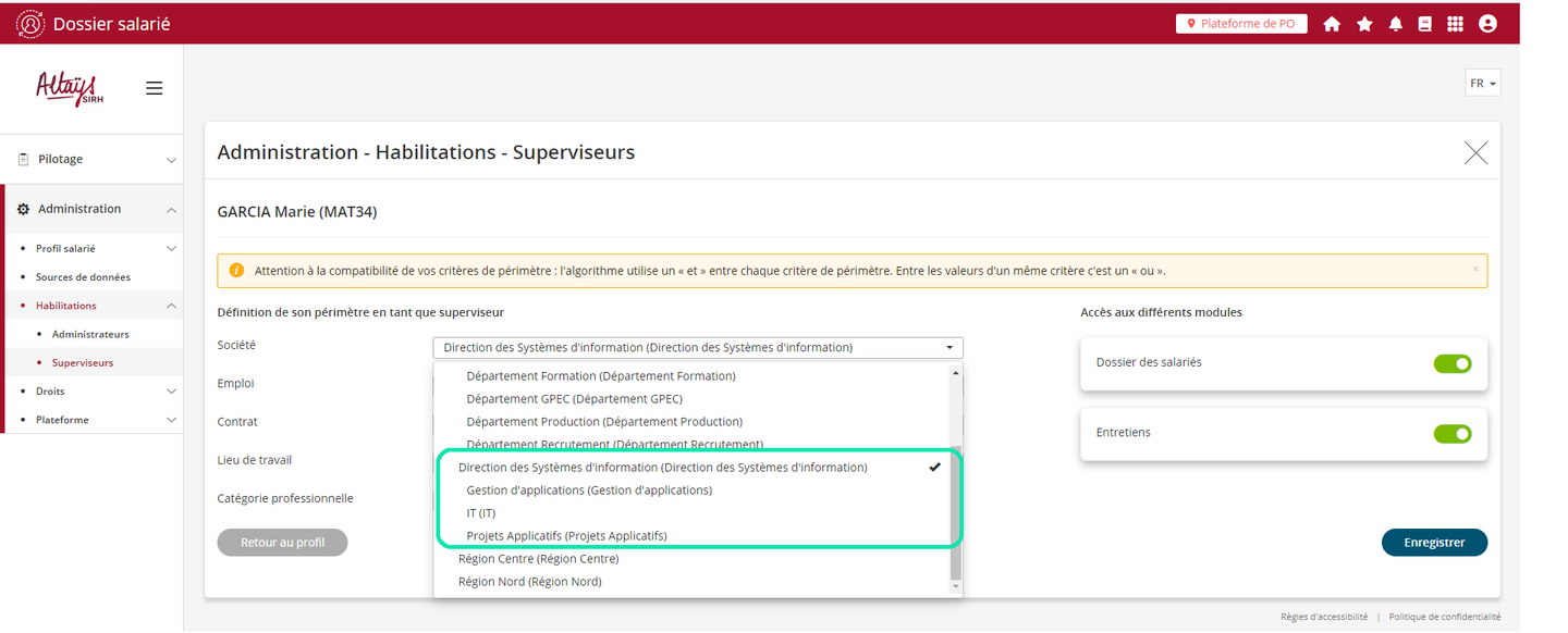Exemple ci-dessous avec la sélection couvrant l’ensemble de la Direction des systèmes d’information. Dans l’ancienne version, seule les collaborateurs directement positionnés sur la valeur “Direction des Systèmes d’information” étaient inclus dans le périmètre du superviseur. Désormais, toutes les collaborateurs affectés sur les entités subordonnées sont également inclus.
