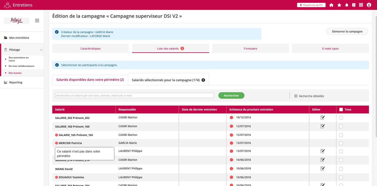 Lorsque le superviseur ne couvre plus la totalité des collaborateurs présents dans la campagne il ne peut plus démarrer ou clôturer la campagne et les collaborateurs hors de son périmètre lui sont signalés par un pictogramme d’alerte.