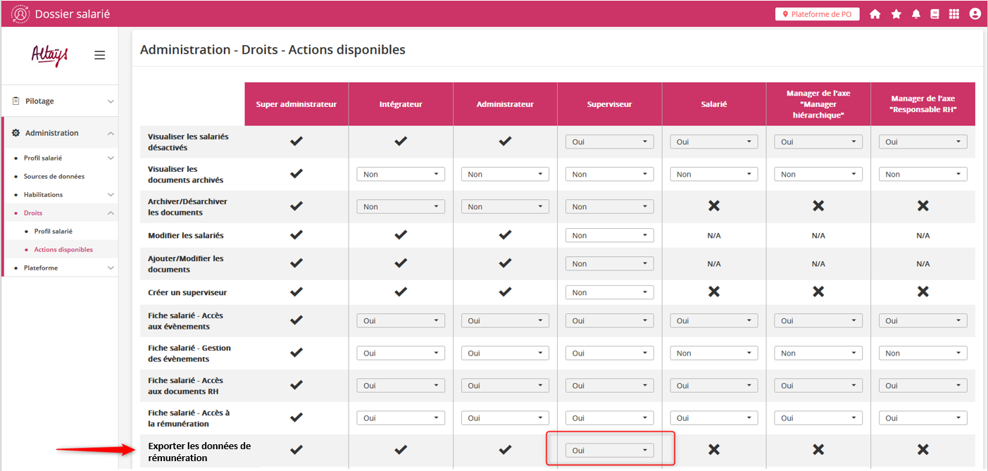 Cette fonctionnalité est ouverte aux administrateurs par défaut. En revanche pour donner la possibilité aux superviseurs d’exporter les données de rémunération (dans la limite de leur périmètre), il faut activer le droit dans Administration> Droits> Actions disponibles.