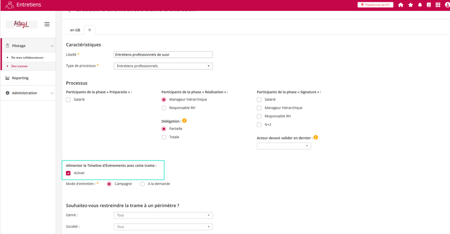 L’objectif de cette configuration, est d’identifier les types d’entretiens pertinents à afficher dans le cadre du fil d'événements. Il peut notamment être intéressant d’y afficher les entretiens professionnels (au sens de la loi sur la formation professionnelle du 5 mars 2014) pour qu’ils puissent être consultés en prévision ou pendant l'état des lieux récapitulatifs à faire tous les six ans.