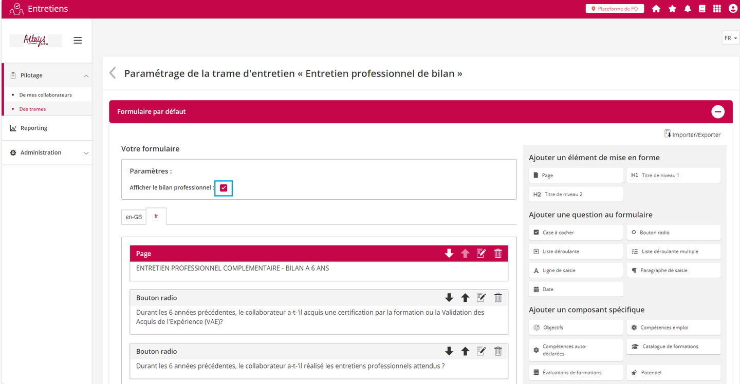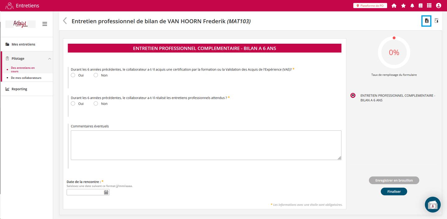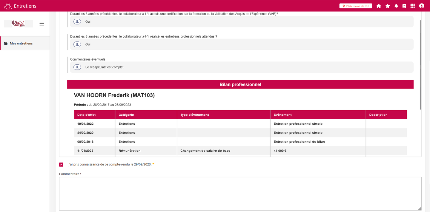Une nouvelle fonctionnalité permet de générer un document d'état des lieux récapitulatif du parcours du collaborateur et de l’associer à un formulaire d’entretien. Cette fonctionnalité prend son sens dans le cadre de l'entretien professionnel de bilan à réaliser tous les six ans qui exige de l’employeur qu’il dresse un récapitulatif du parcours du collaborateur sur la période précédente et qu’il lui remette. La fonctionnalité permet d'éditer automatiquement ce récapitulatif qui peut ensuite faire l’objet de commentaires dans le cadre de l’entretien.