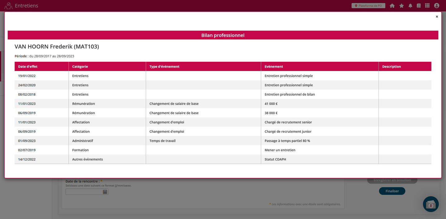 Pour mettre en place cette fonctionnalité, il est nécessaire d’utiliser le fil d'événements dans le dossier salarié. Il sert de base à la production du récapitulatif qui filtre les évènements ayant une date d’effet comprise entre le jour d’ouverture de l’entretien et six ans auparavant.