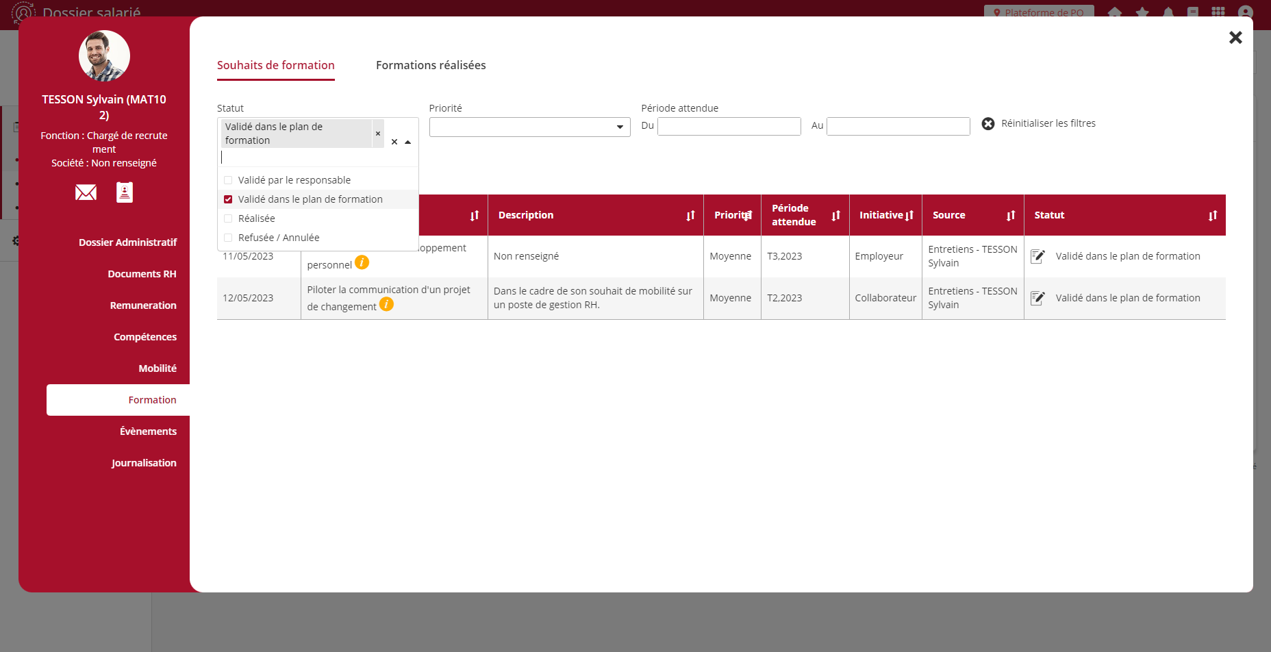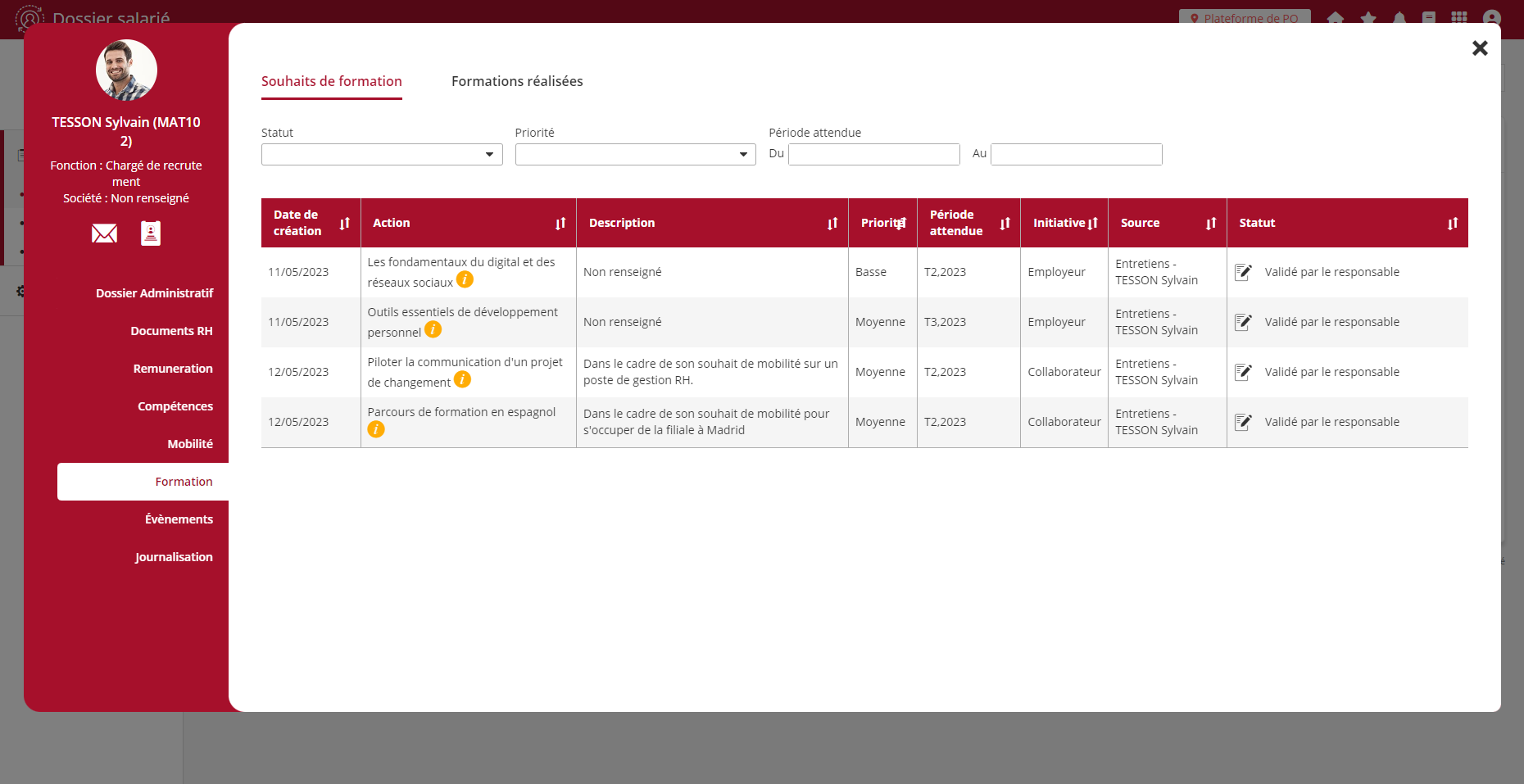La rubrique formation du dossier salarié est enrichie d’une nouvelle page qui consolide les souhaits de développement identifiés pour un collaborateurs. Les souhaits sont organisés sous forme de tableau indiquant leur date de création ainsi que les données de contexte du souhait (Description, Priorité, Période attendue, etc.). Ce tableau apporte également une dimension de suivi avec une colonne indiquant le statut du souhait.