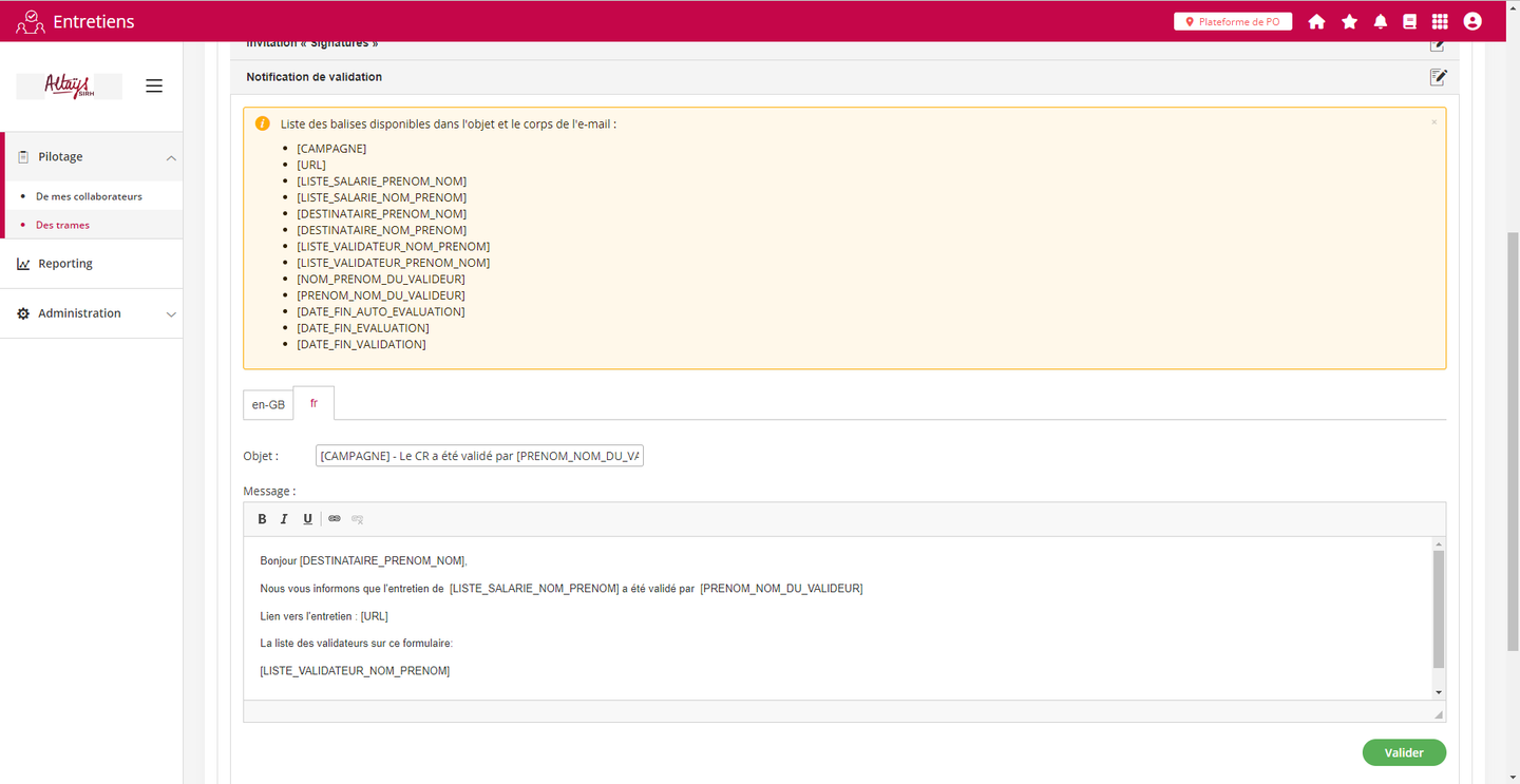 Un nouveau type de notification est ajouté dans le suivi des entretiens pour couvrir la phase de “validation” de l’entretien. L’objet de cette notification est d’informer les autres participants de cette phase qu’une validation a été réalisée. Le paramétrage de cette notification peut être réalisé au niveau de la trame ou au niveau de la campagne. Les balises applicables à cette notification sont affichées au dessus de l’espace de rédaction du modèle de message.