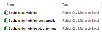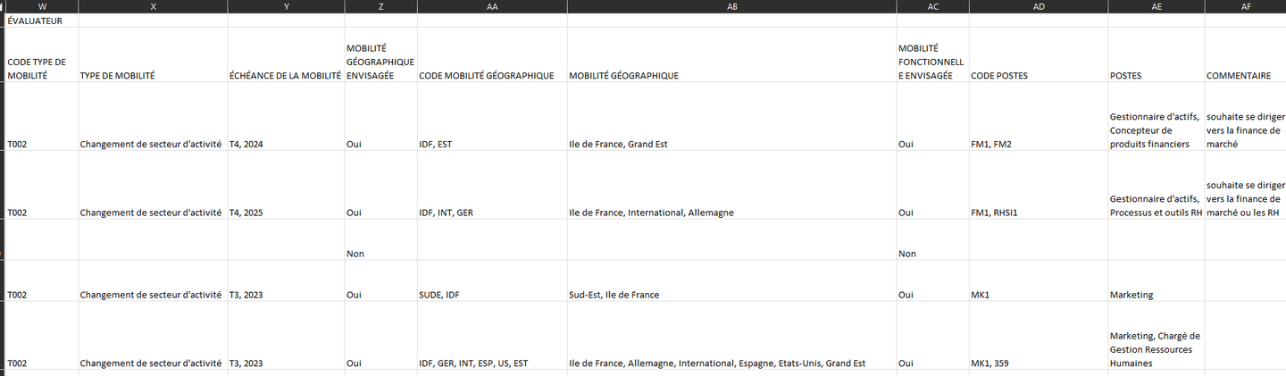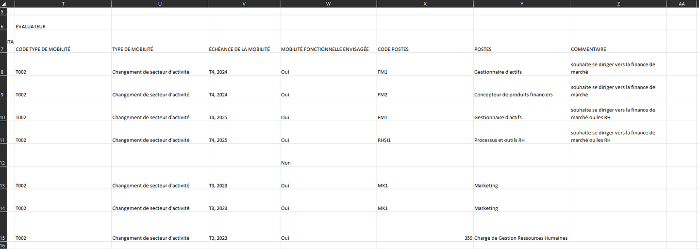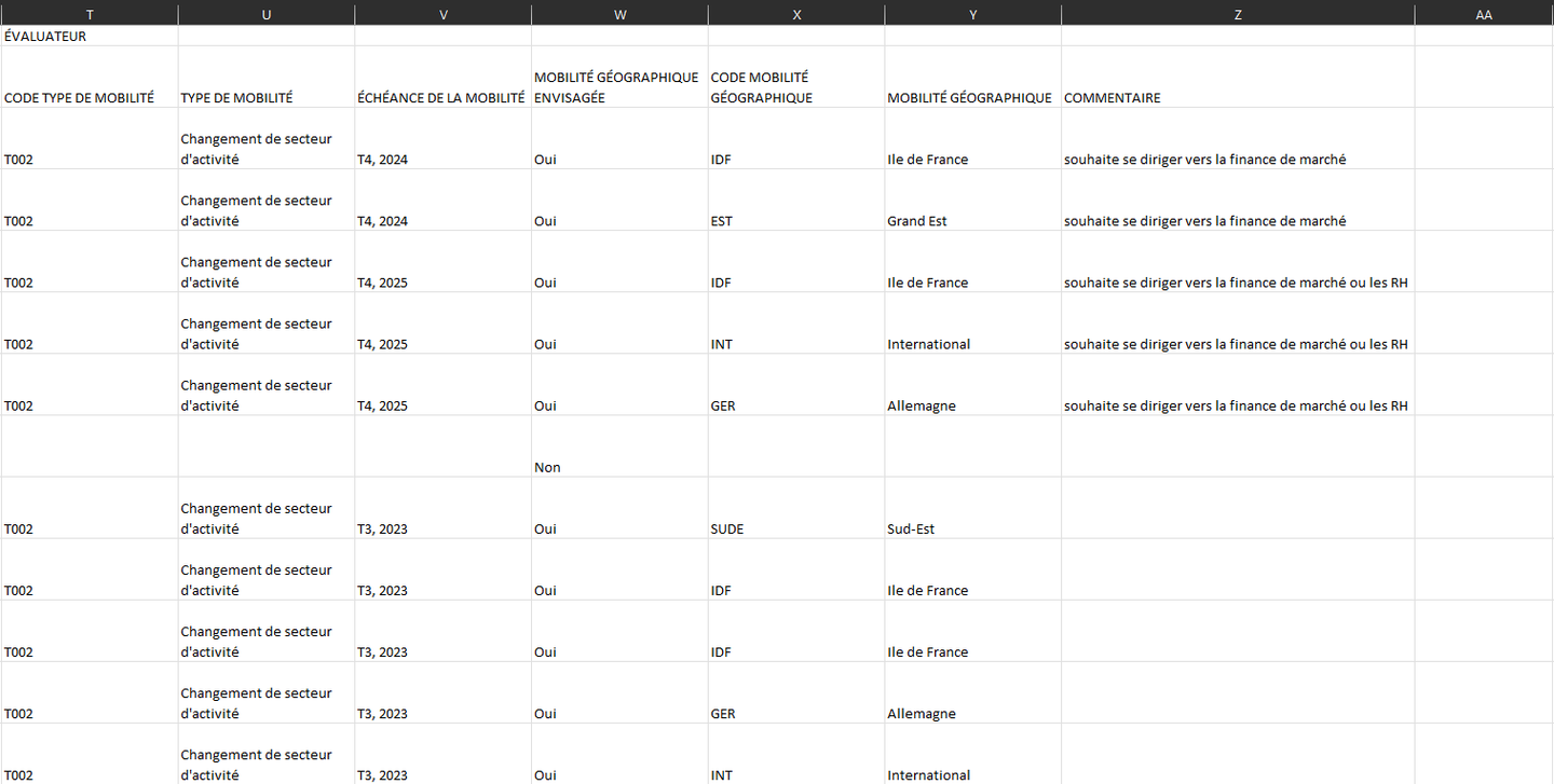 Le rapport “Souhaits de mobilité fonctionnelle” permet de lister plus finement les métiers cibles des collaborateurs. Chaque métier est identifié par une ligne du fichier.