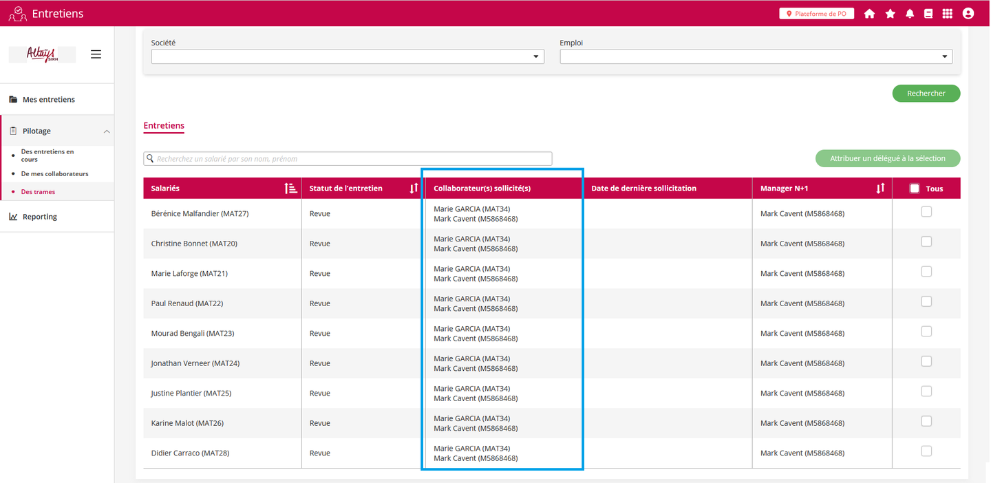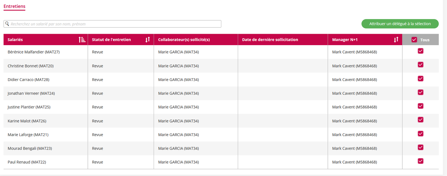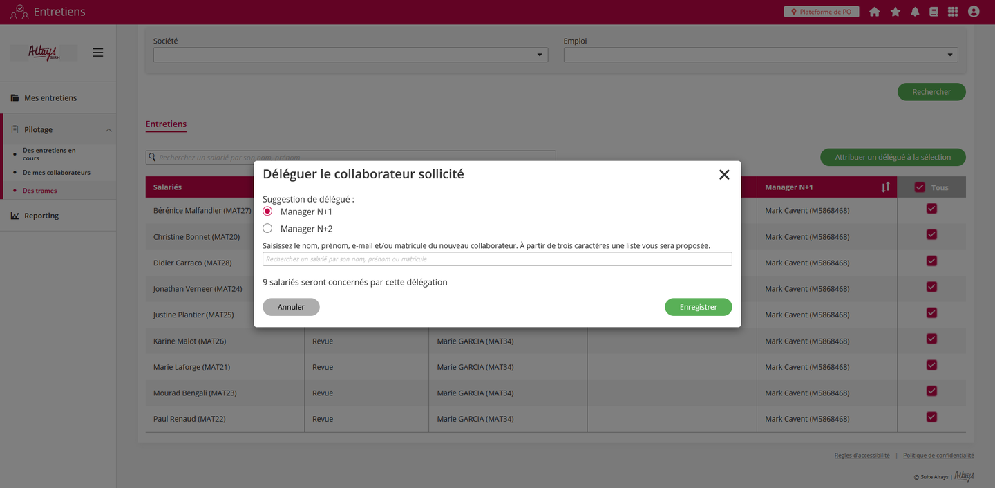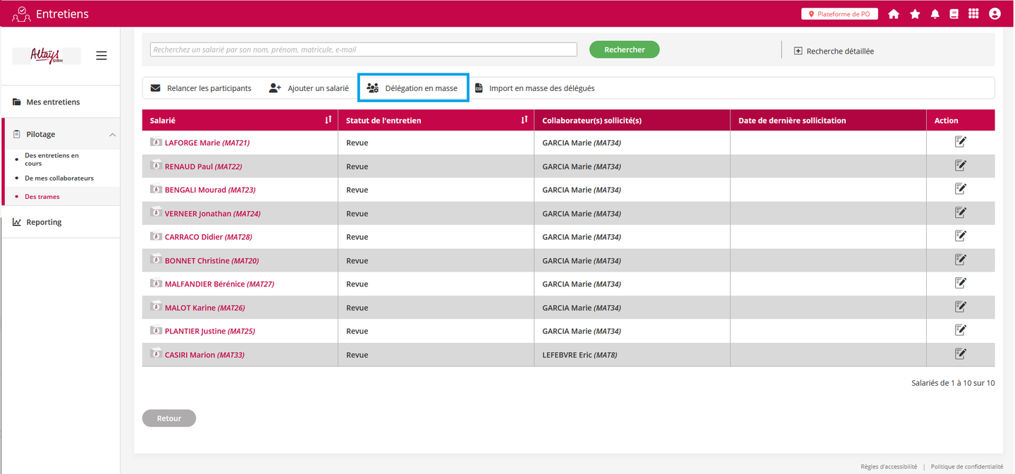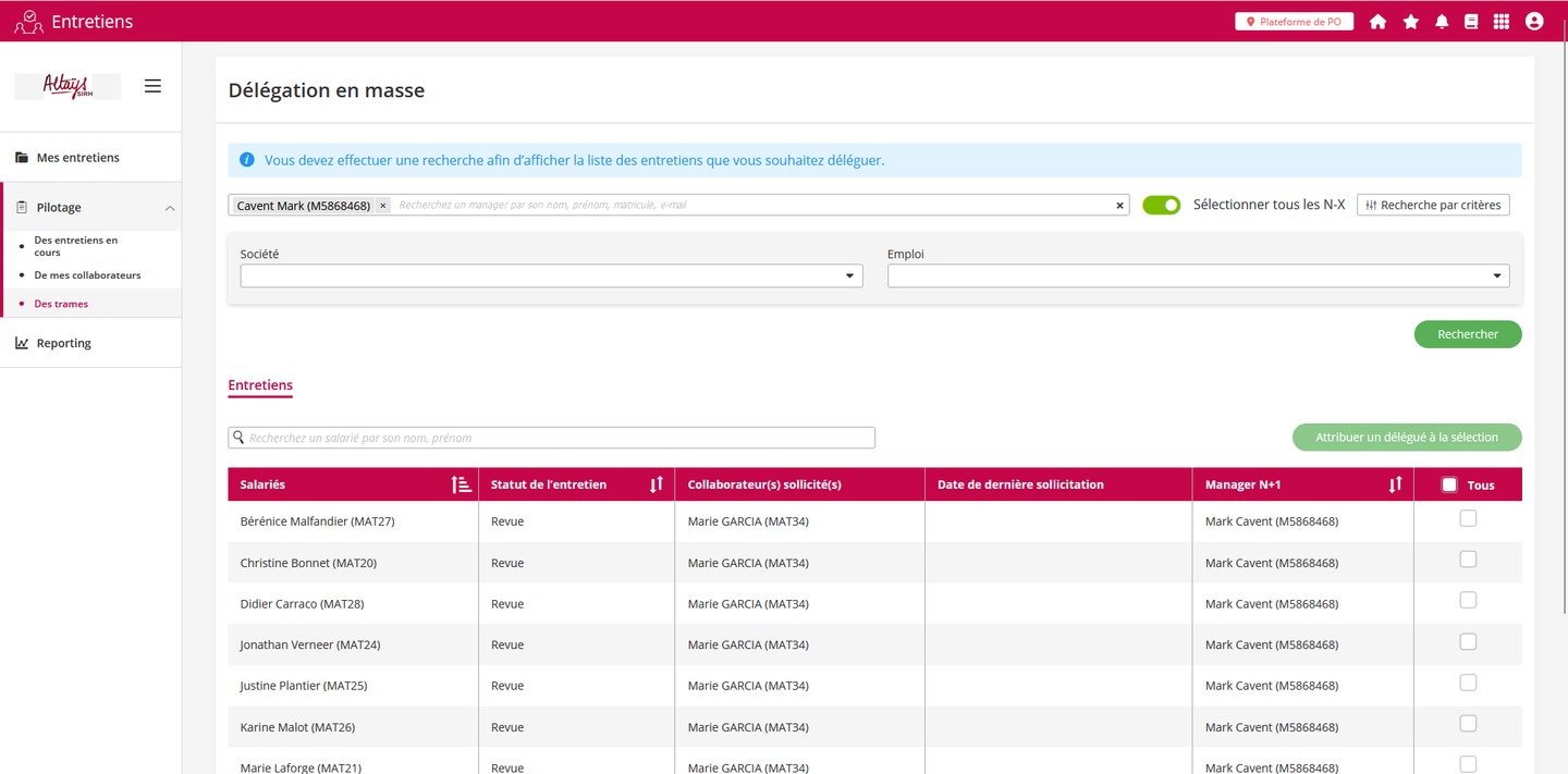 Une nouvelle fonctionnalité permet de déléguer les formulaires d’entretiens ou de revues sur un grand nombre de collaborateurs. Cette nouvelle fonctionnalité se différencie de celle existante permettant d’importer des fichiers CSV pour réaliser les délégations par le fait que les opérations de délégation se font directement dans l’application et avec une plus grande souplesse.