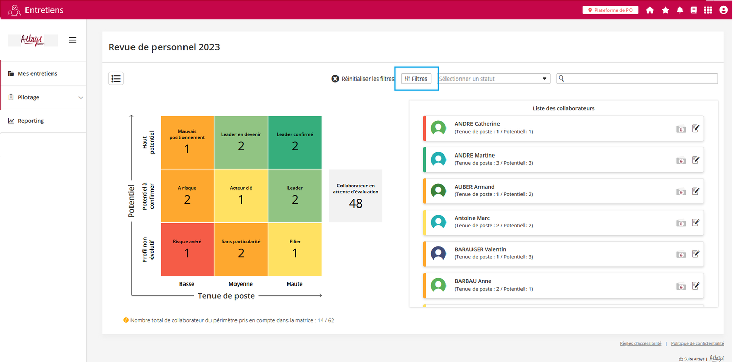 Un nouveau bouton de filtres avancés est ajouté dans la page de matrice des talents de la revue de personnel.