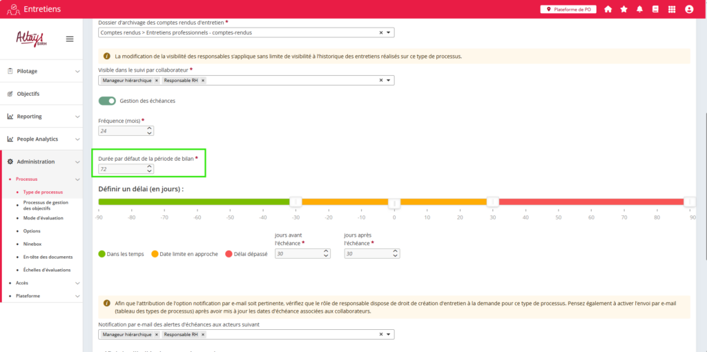 Une nouvelle option est ajoutée dans le paramétrage des types de processus pour permettre de définir la durée par défaut applicable lors de la génération de l'état des lieux récapitulatif de carrière du collaborateur, nommé dans l’application “bilan professionnel”.
