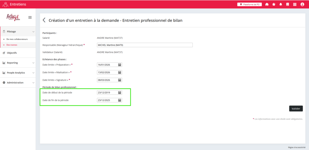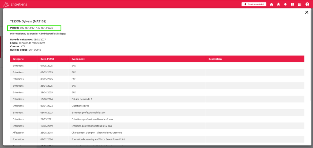 Lors de l’ouverture d’un entretien paramétré pour être accompagné d’un bilan professionnel, cette durée sera prise en compte pour déterminer l’intervalle de consolidation des événements du dossier à intégrer dans le document de bilan.