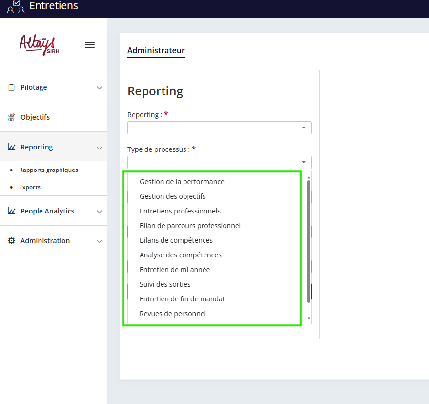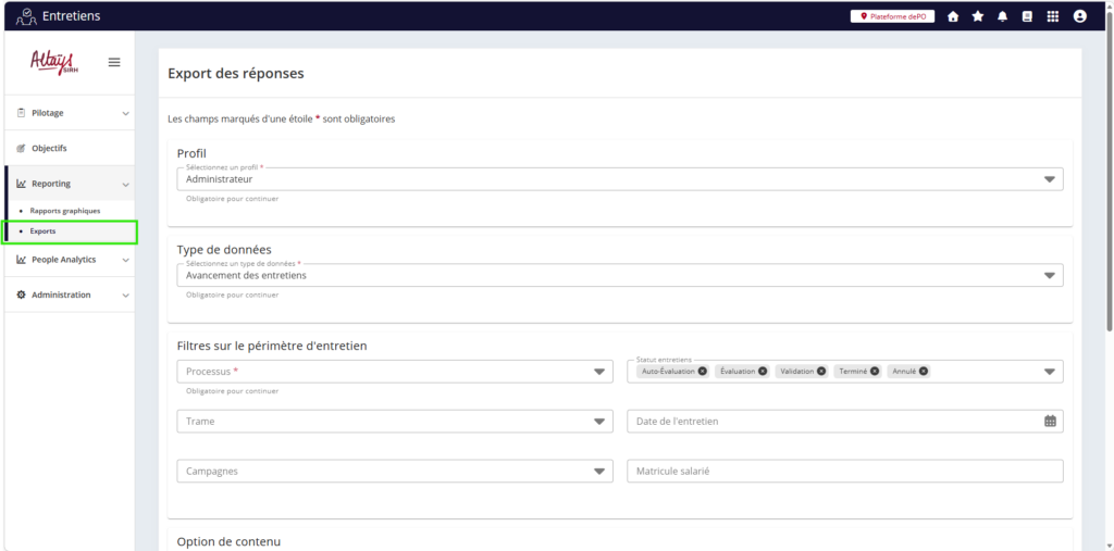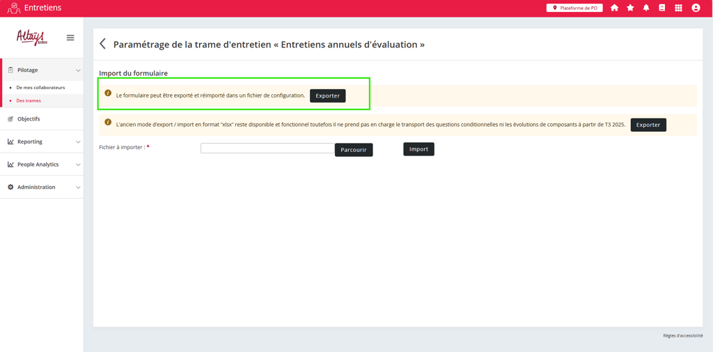 Un nouveau format d’export / import du paramétrage du formulaire d’entretien est proposé. Il s’agit d’un format propriétaire Altays non modifiable en dehors de l’application et qui remplacera à terme le format excel proposé aujourd’hui.