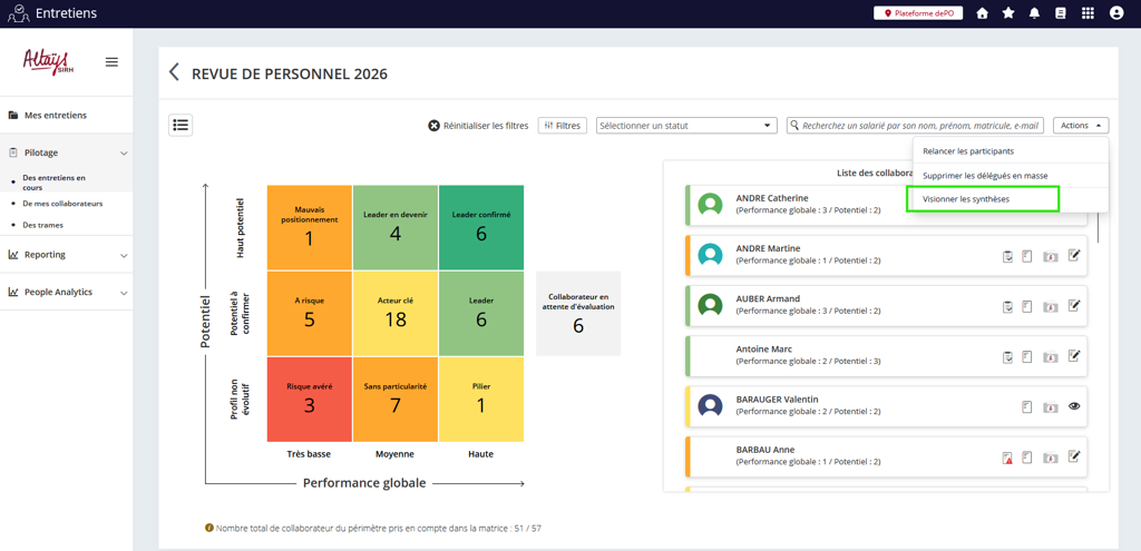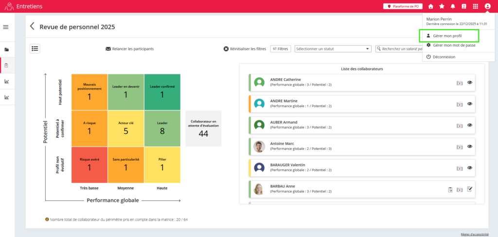 Des nouveaux filtres sont ajoutés dans la vue Matrice de la revue de personnel, ils permettent d’isoler les populations en fonction des différents types de responsable existants dans la solution (Hiérarchique, RH, Fonctionnel) et affectés dans les dossiers des collaborateurs.