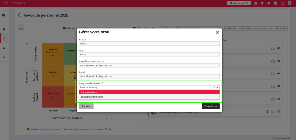 La langue de connexion est désormais pilotée par la langue de préférence déterminée au niveau du profil de l’utilisateur pour les modules Dossier salarié, Entretiens, Revue de personnel et GPEC.