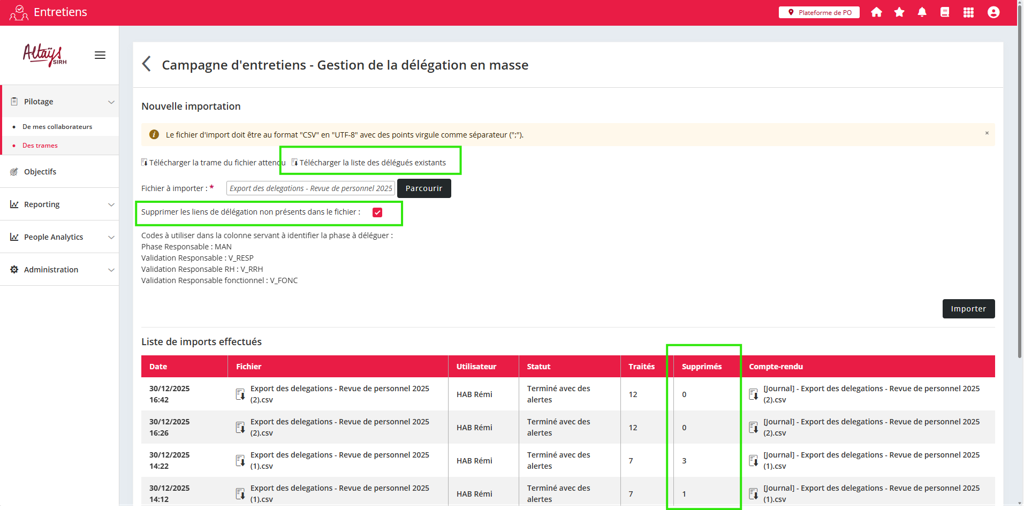Une case à cocher permet de définir que les liens de délégation absents du fichier importé soient supprimés à l’occasion de la mise à jour des délégués