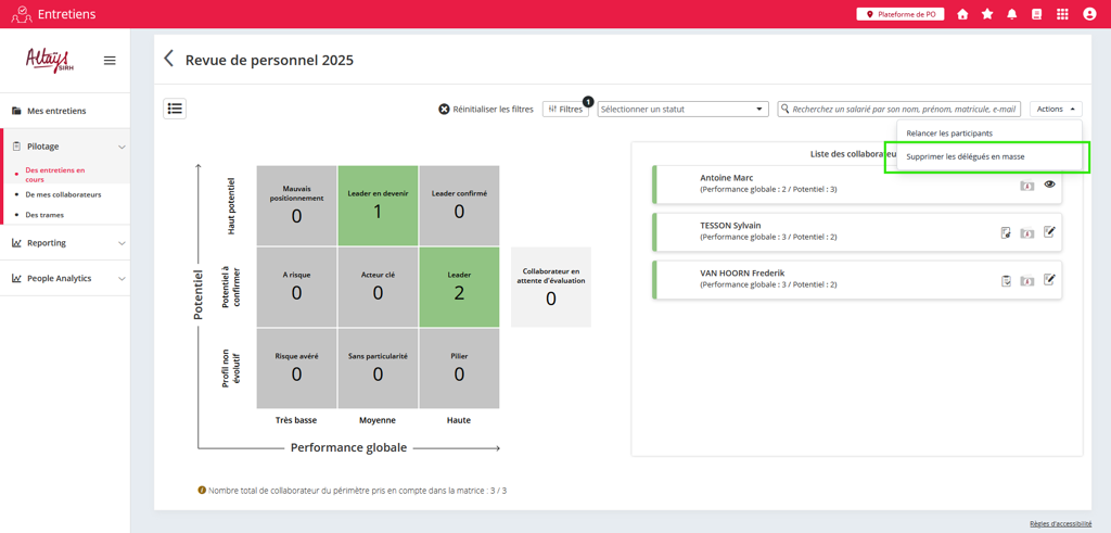 Une nouvelle fonctionnalité dans la vue matrice permet aux responsables des revues de remettre à zéro les délégations sur leur périmètre ou sur un sous ensemble de leur périmètre (l’action tient compte des filtres effectués).