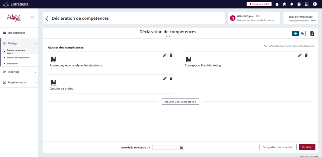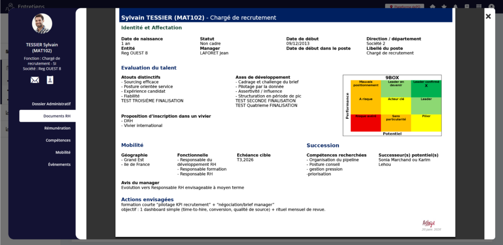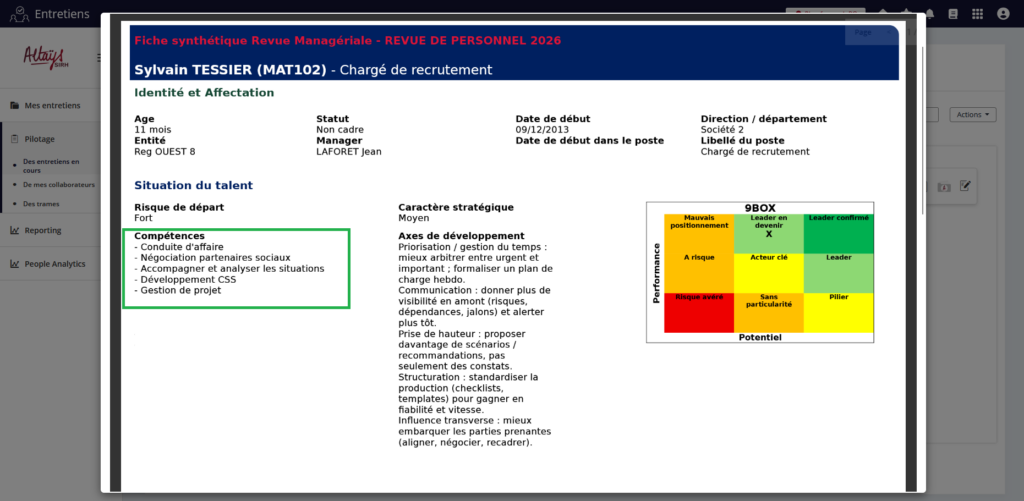 Ces compétences sont désormais consolidées dans le profil du collaborateur lorsque le formulaire est finalisé. Il n’existe toutefois à ce stade aucune vue pour les consulter dans le dossier individuel.