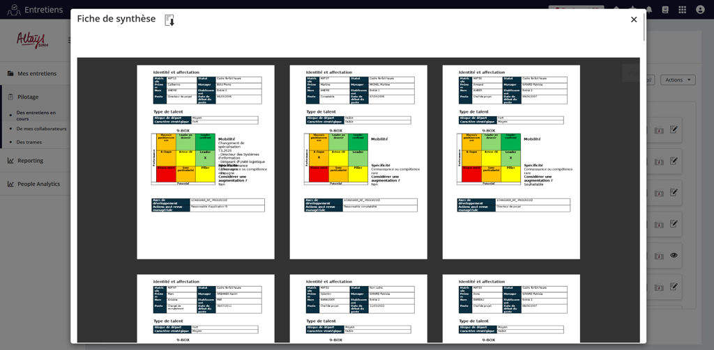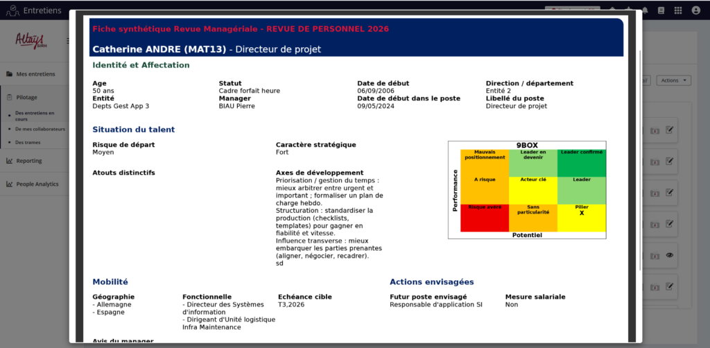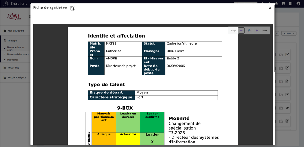 La fonctionnalité fiche de synthèse offre aux participants de la revue de personnel une vision synthétique de la situation du collaborateur en conciliant les données issues du dossier salarié et les données saisies dans le formulaires de revue.