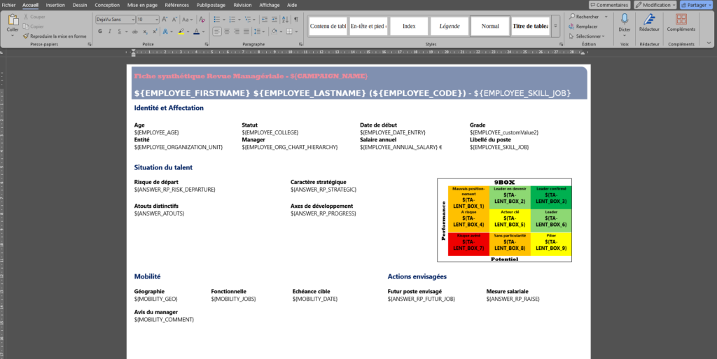 La nouvelle balise ${DECLARED_SKILLS} permet ainsi de récupérer cette liste de compétences consolidée au niveau du profil pour être affichée dans la fiche de synthèse de la revue de personnel suivante.