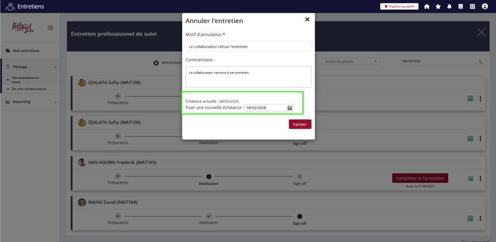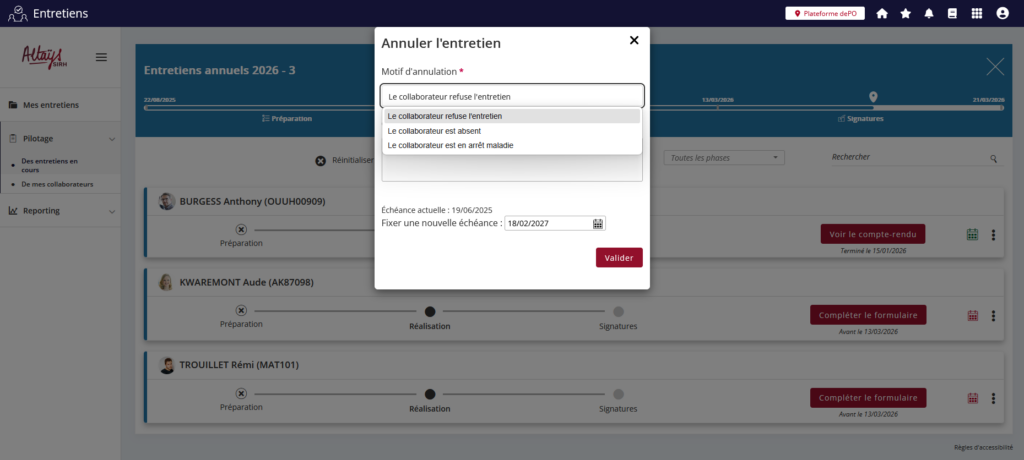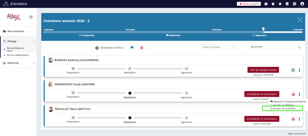 Une nouvelle option (activable par un administrateur Altays) permet de donner aux profils responsables (Hiérarchique, RH, fonctionnel) le droit d’annuler les entretiens de leurs collaborateurs.
