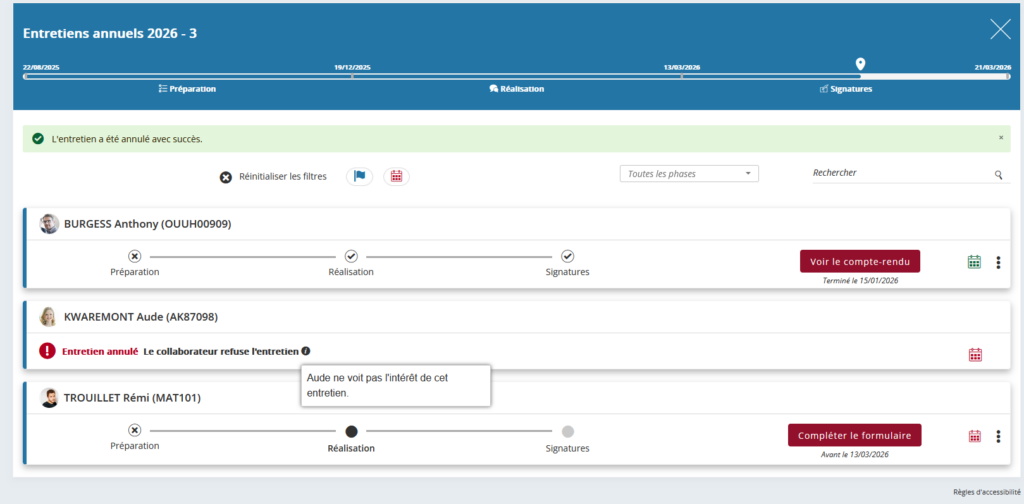 Une fois validé, le motif d’annulation et son éventuelle description sont affichés dans le tableau de suivi des entretiens.