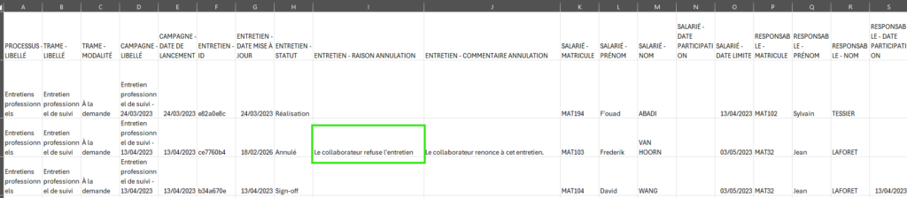 Le motif d’annulation est également ajouté aux données disponibles de l’export “Suivi d’avancement”.