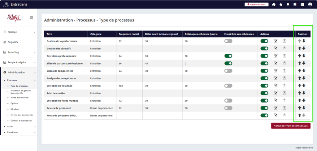 Une nouvelle option apparaît dans le tableau des “Types de processus” pour permettre à l’administrateur de définir l’ordre d’affichage dans différents écrans de la solution.