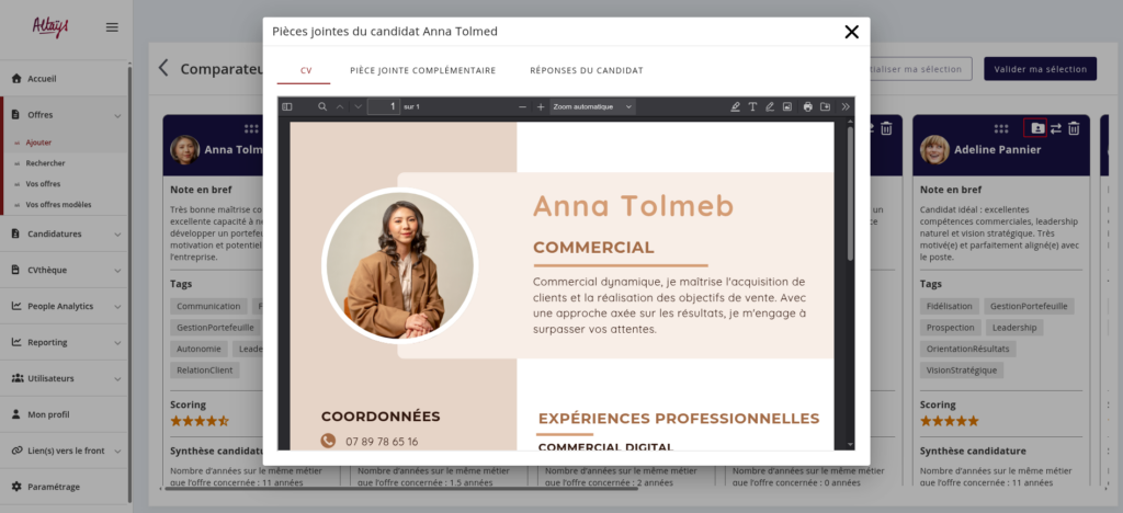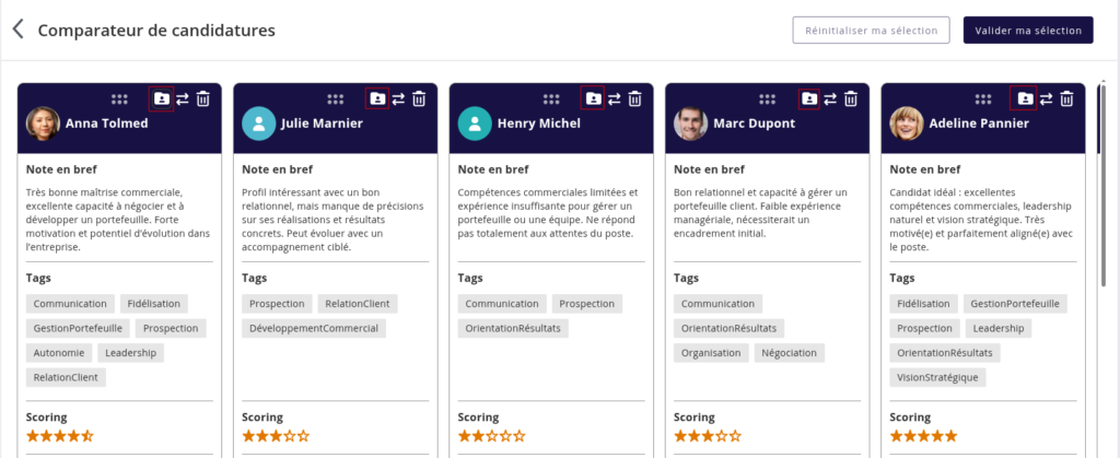 Désormais, vous pouvez ouvrir directement ces éléments depuis le comparateur, en cliquant sur l’icône disponible en haut à droite de la fiche candidat.