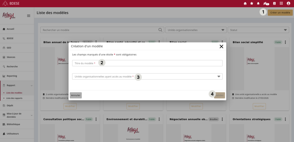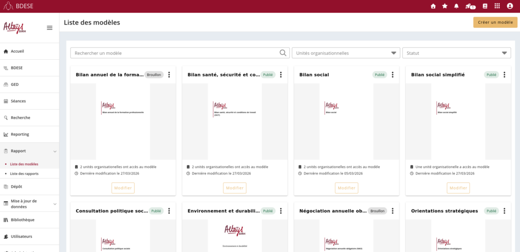 Depuis le menu Liste des modèles, gérer et structurer les modèles selon votre organisation. Vous pouvez par exemple créer des modèles de rapports différents selon la taille de vos unités organisationnelles. Vous maîtrisez ainsi la communication réalisée, tout en homogénéisant vos pratiques.